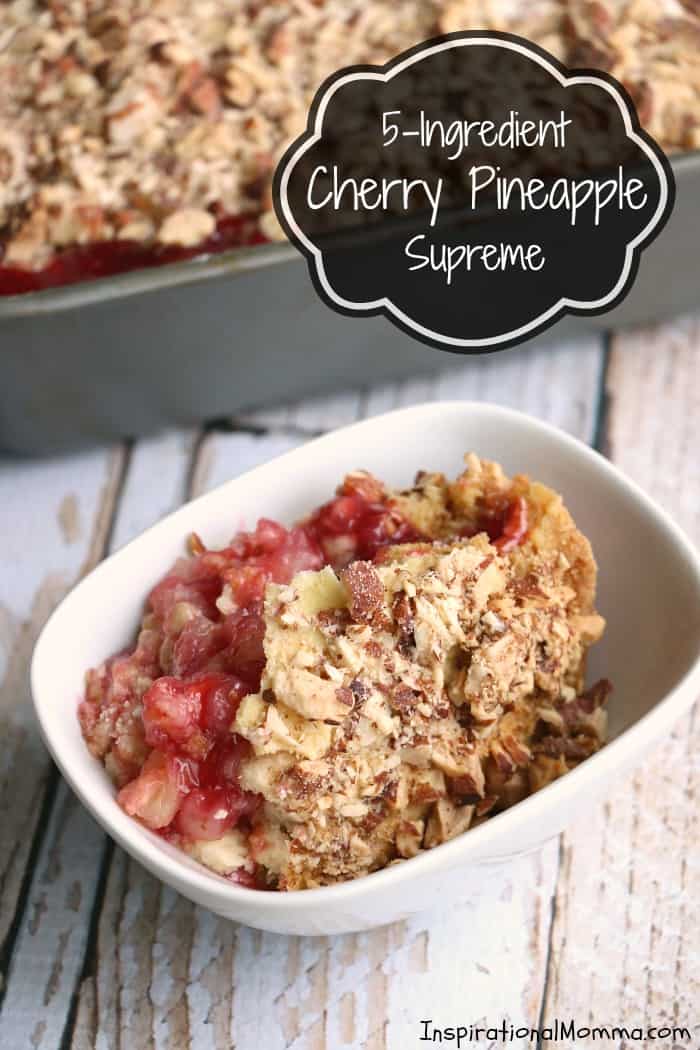 We have all been there! Somewhere to go, but nothing to take. This 5-Ingredient Cherry Pineapple Supreme is one of my go-to desserts when I am running low on prep time! I know this may seem unbelievable, but you literally dump each of the five ingredients into a pan, bake, and enjoy!