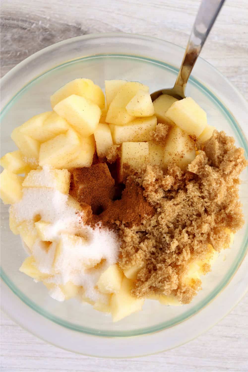 In a medium mixing bowl, combine peeled, chopped apples with brown sugar, sugar, and cinnamon until apples are coated.