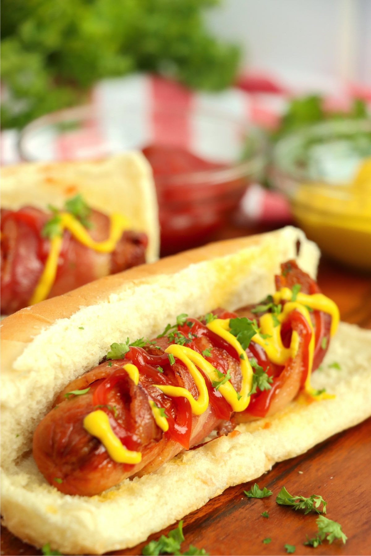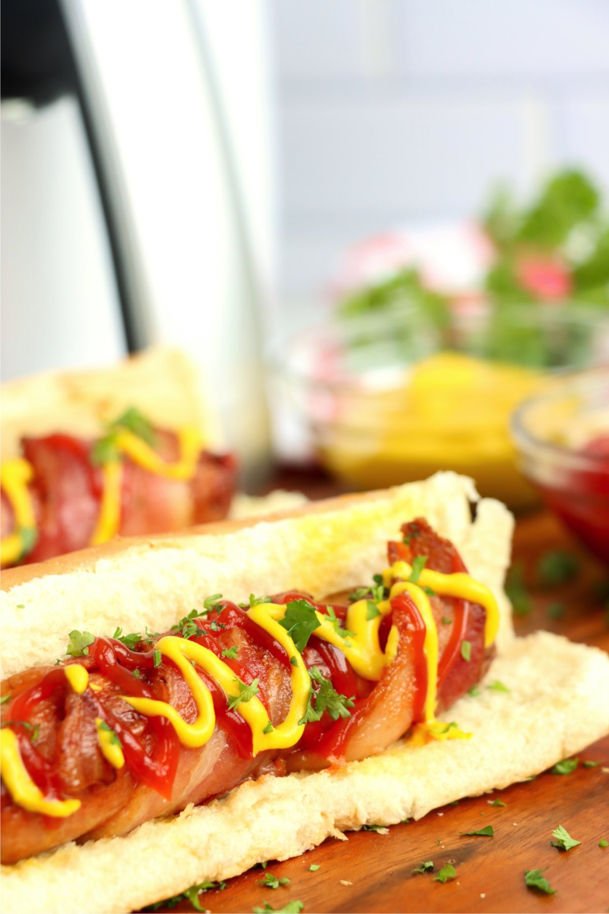 Air fryer bacon wrapped hot dogs combine a classic grilled food and wraps it up in everyone's favorite piece of pork to create a variation on a hot dog that will have everyone coming back for more.