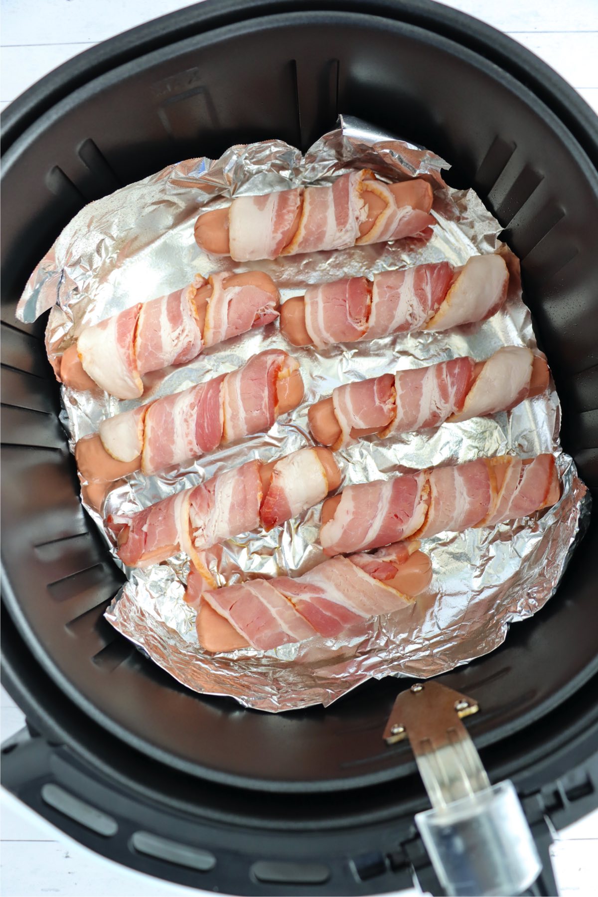 - Line your air fryer basket with foil to avoid a mess while the bacon cooks.