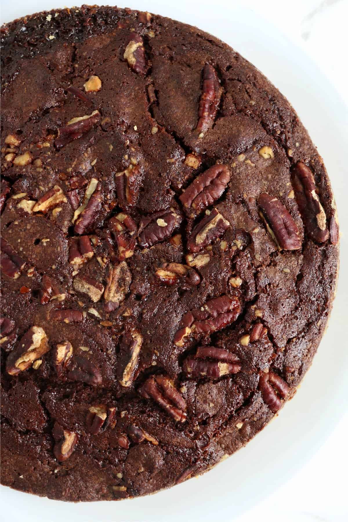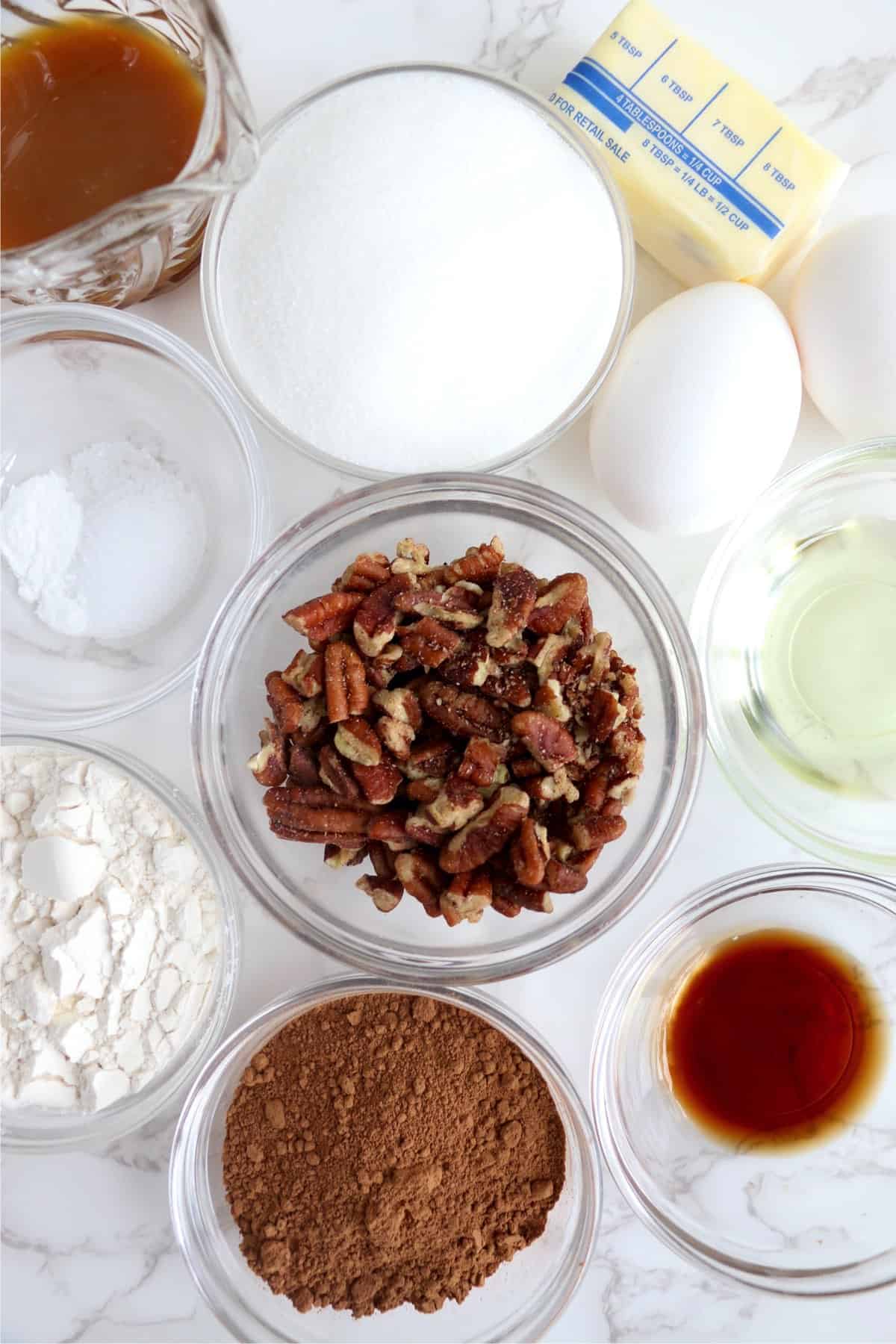 - In a large mixing bowl, combine flour, cocoa powder, sugar, butter, eggs, vegetable oil, vanilla, salt, and baking powder. Stir in pecans.