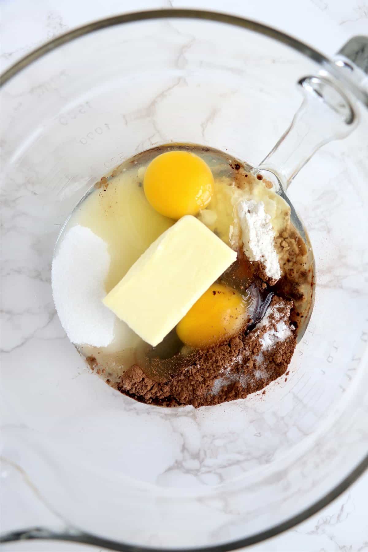 Step 2: In a large mixing bowl, combine flour, cocoa powder, sugar, butter, eggs, vegetable oil, vanilla, salt, and baking powder.