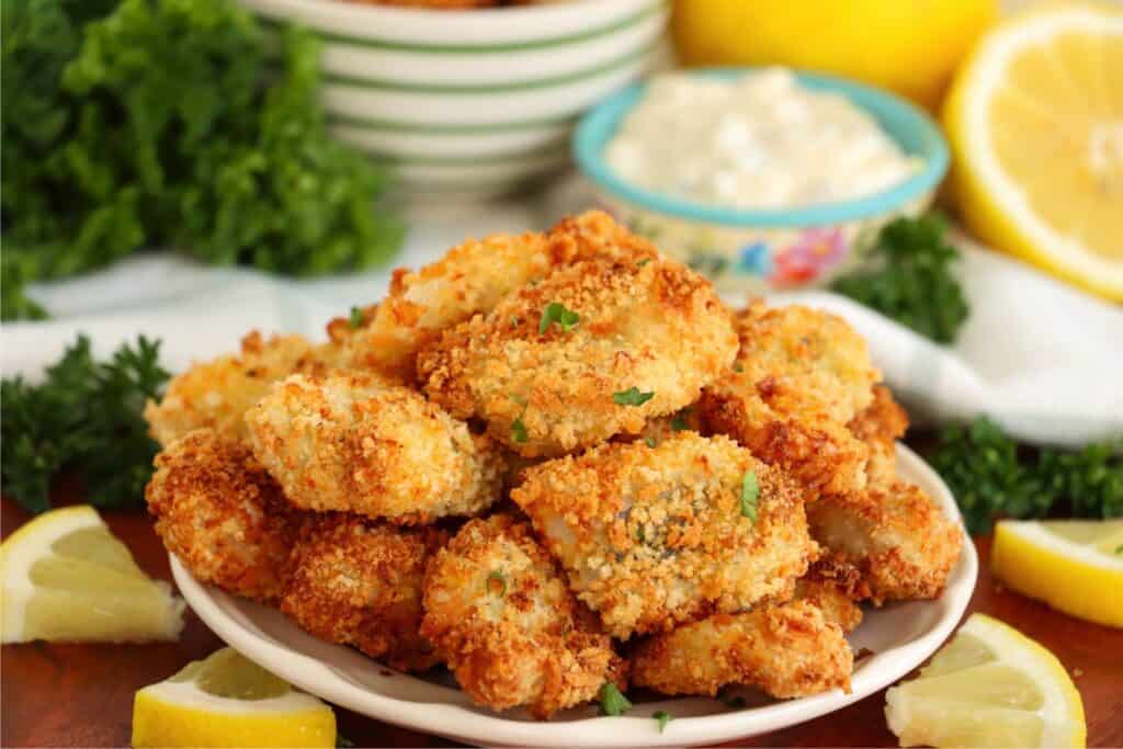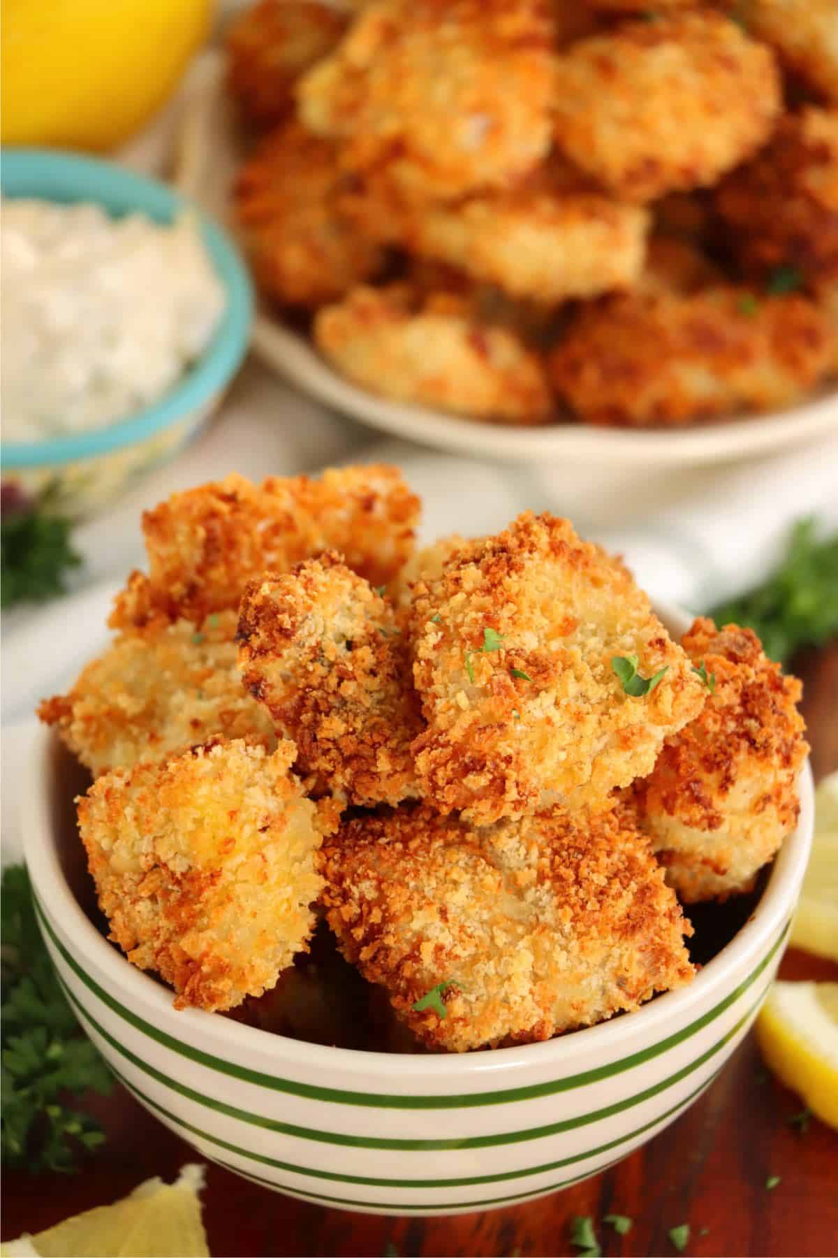 These fried catfish nuggets have all the flavor and texture of traditionally fried fish. As such, they are perfect with all your perfect fried fish sides. Try:
