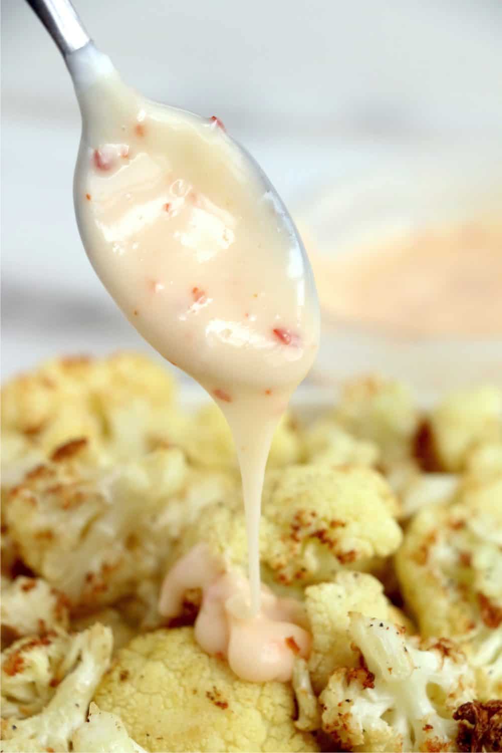 Step 5. Transfer cooked cauliflower from the air fryer to a serving bowl. Drizzle bang bang sauce over the top, saving some for dipping.