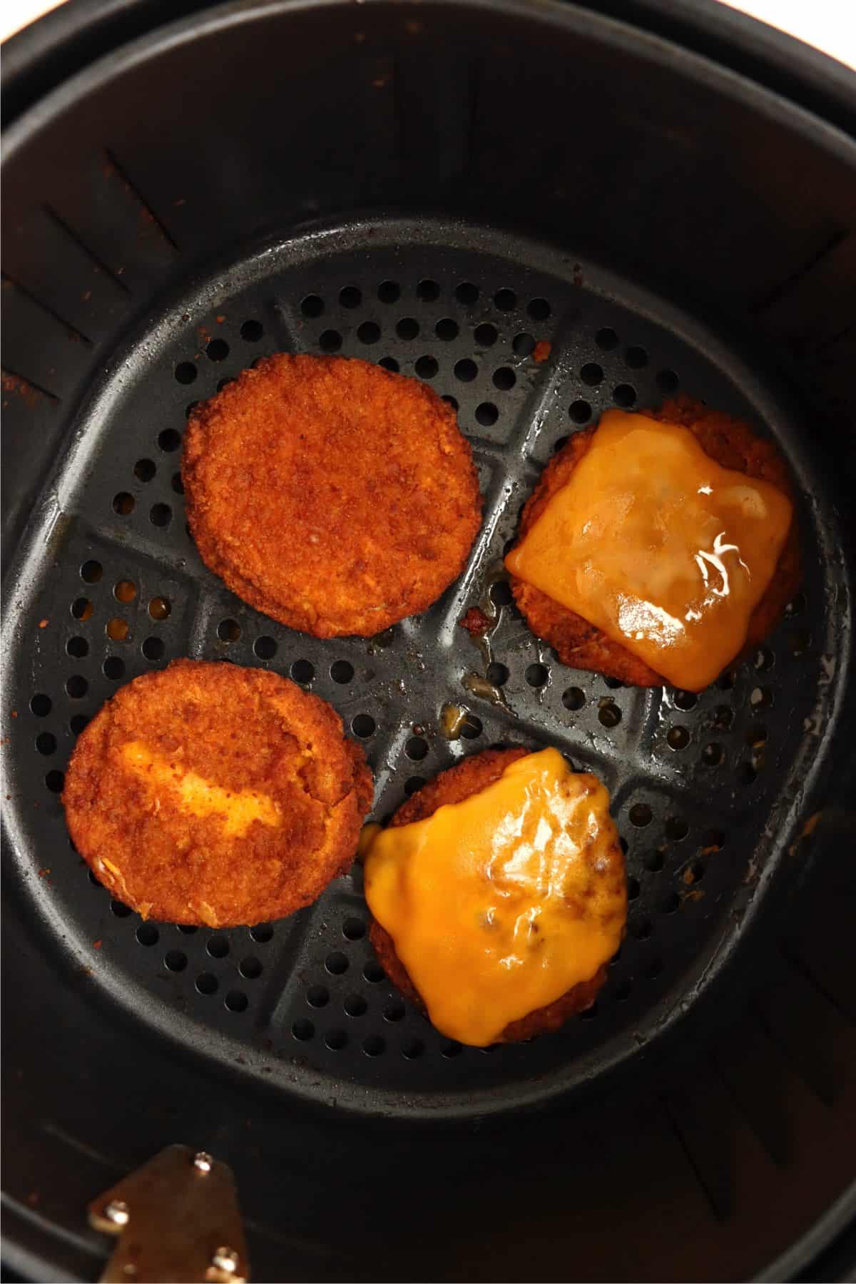 - If you choose to add cheese, place a slice on each patty and close the air fryer, allowing the cheese to melt.