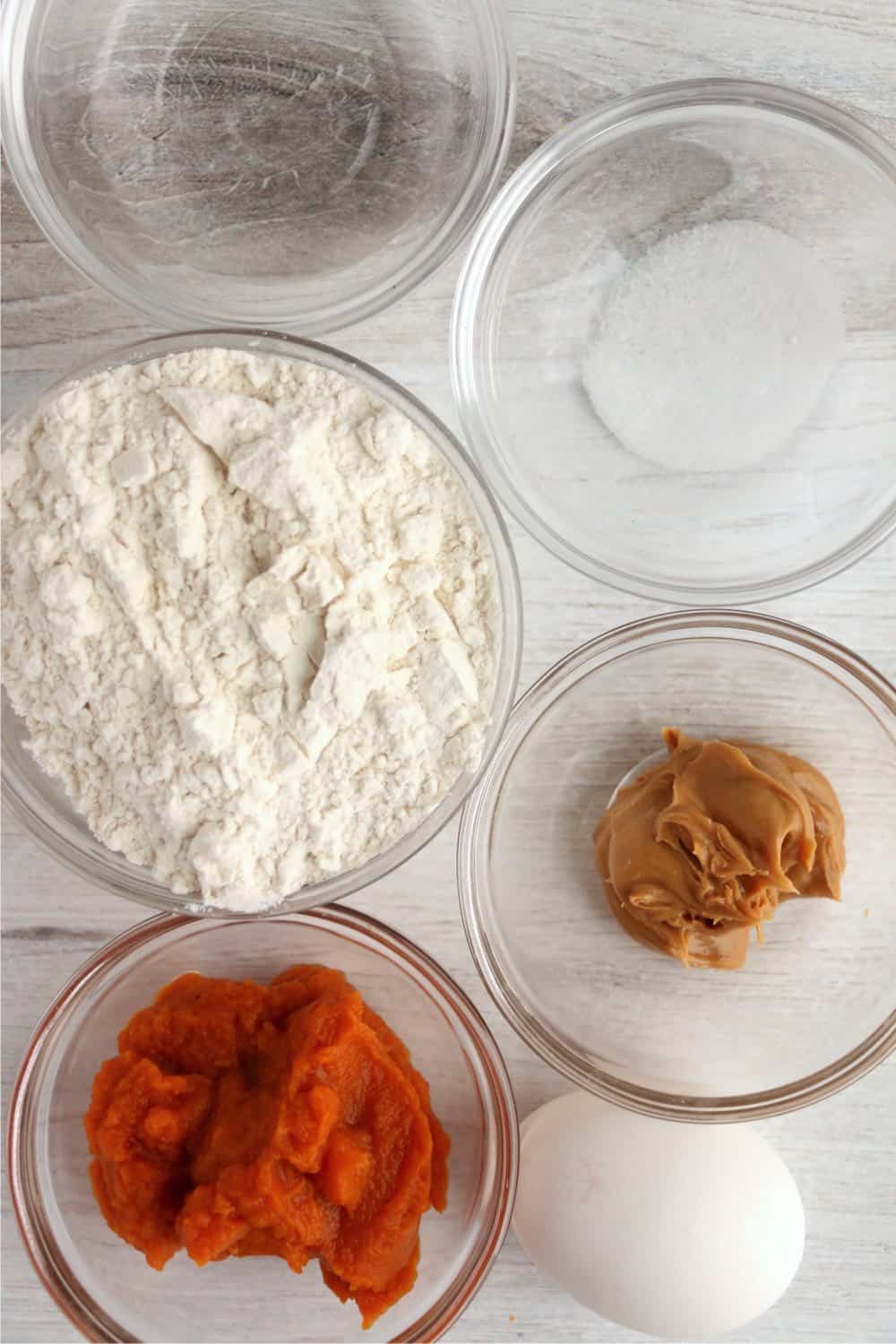 Whisk flour, pumpkin, peanut butter, egg, and salt together in a medium mixing bowl.