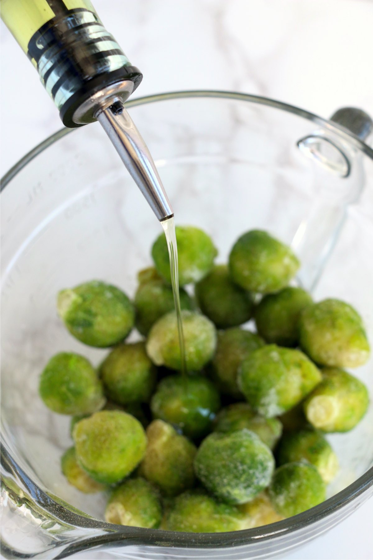 - Place Brussel sprouts, olive oil, salt, and pepper in a medium mixing bowl. Stir to combine.