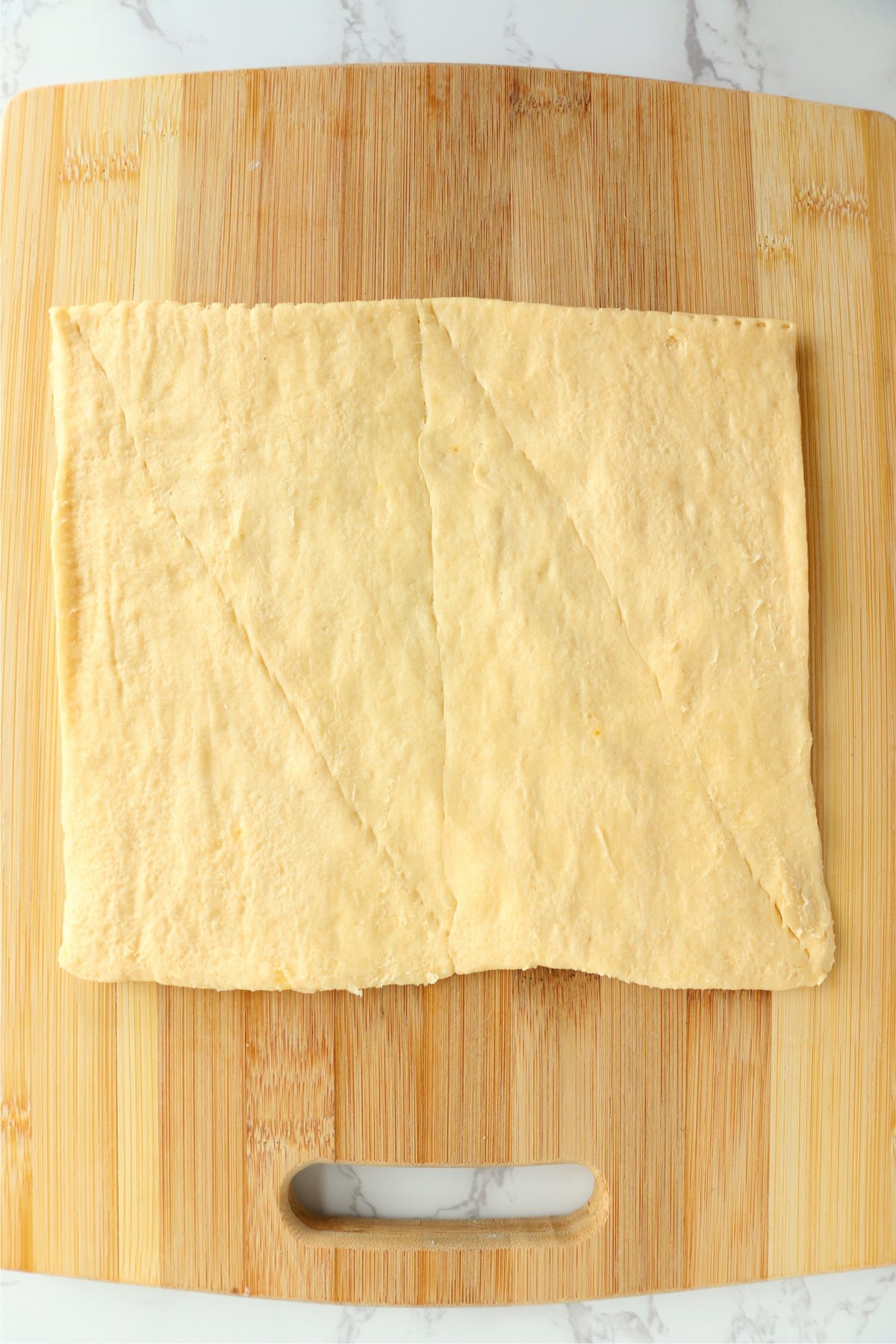 - Roll half the crescent dough out so you can see 4 triangles. Slowly work seams together so you have one piece of dough.