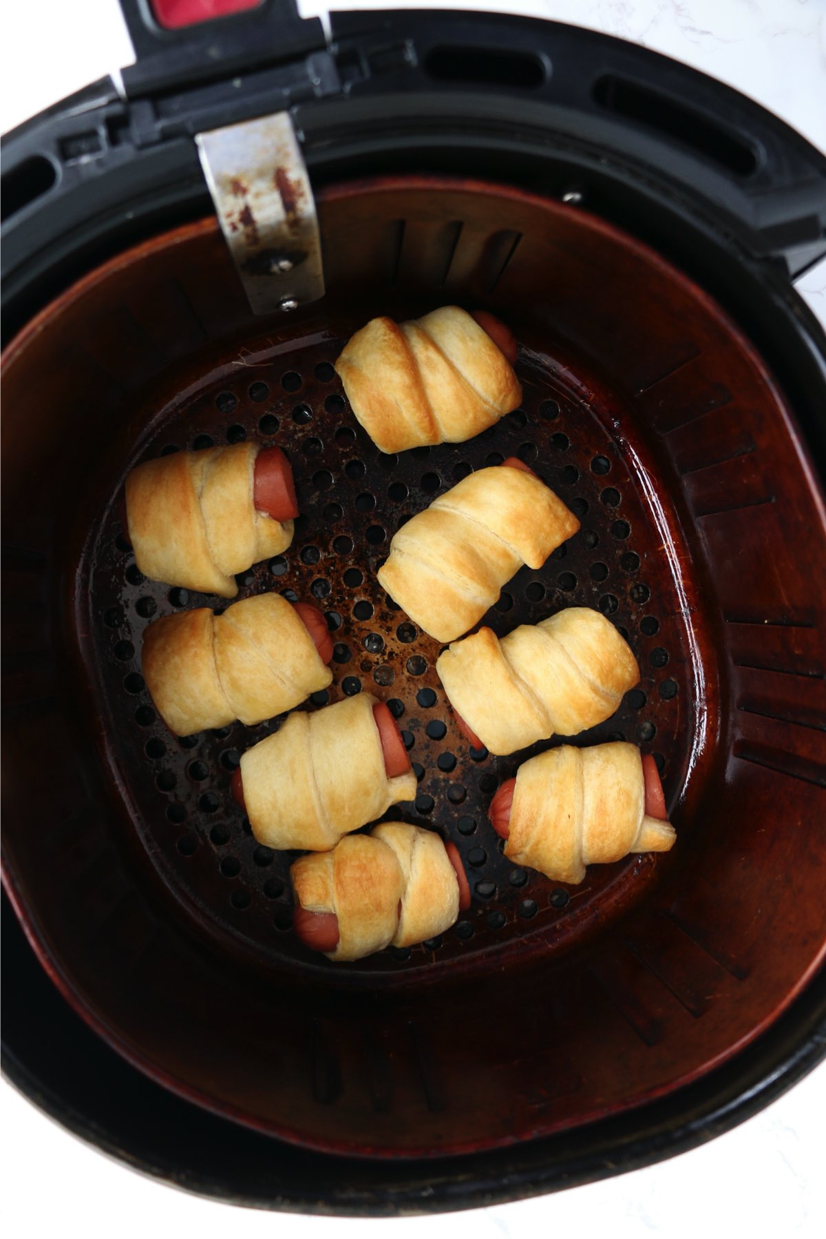 - Place pigs in a blanket in a greased air fryer basket so they are about an inch apart. Depending on the size of your air fryer, you may have to cook in a couple batches.