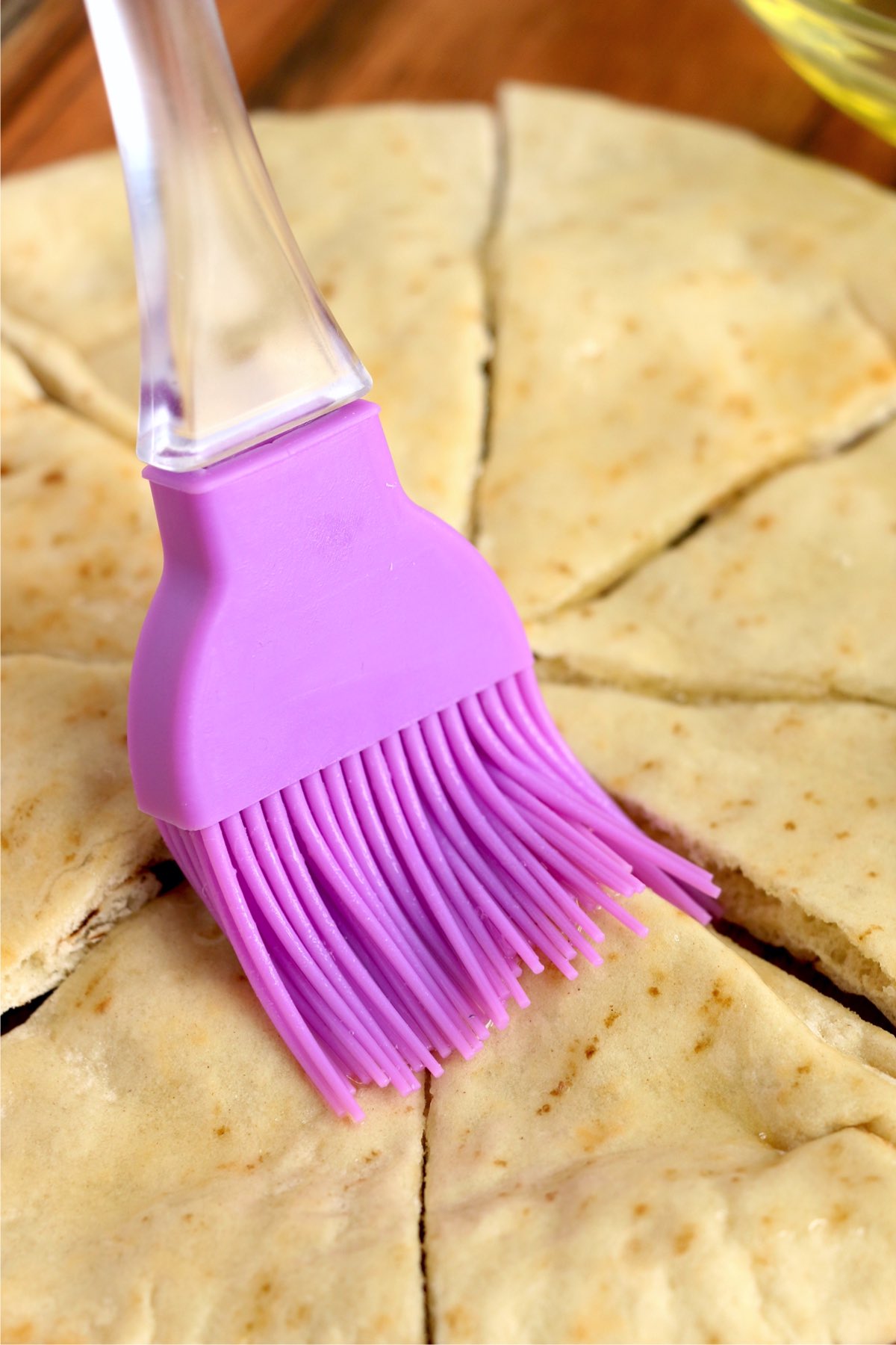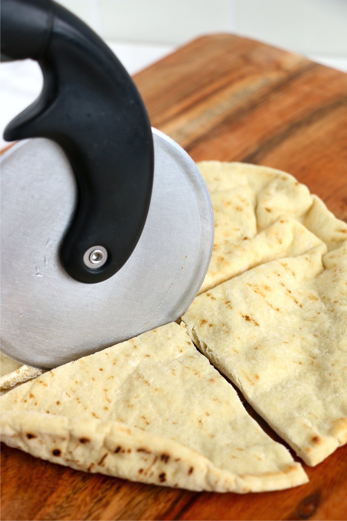 - On your work surface, cut pitas into small triangles. I use a pizza cutter.