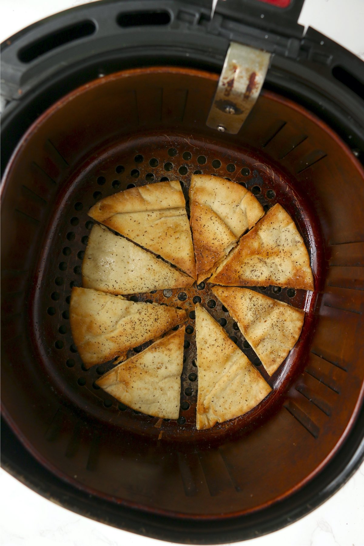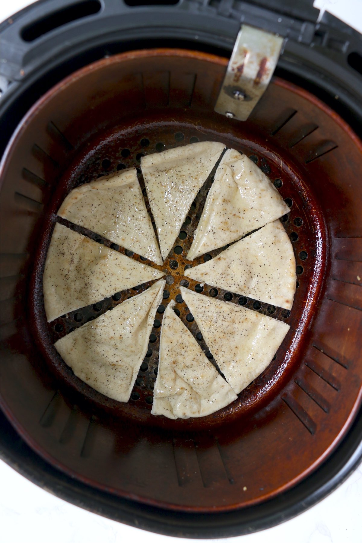 - Place pita pieces in your air fryer basket just so they are not touching.