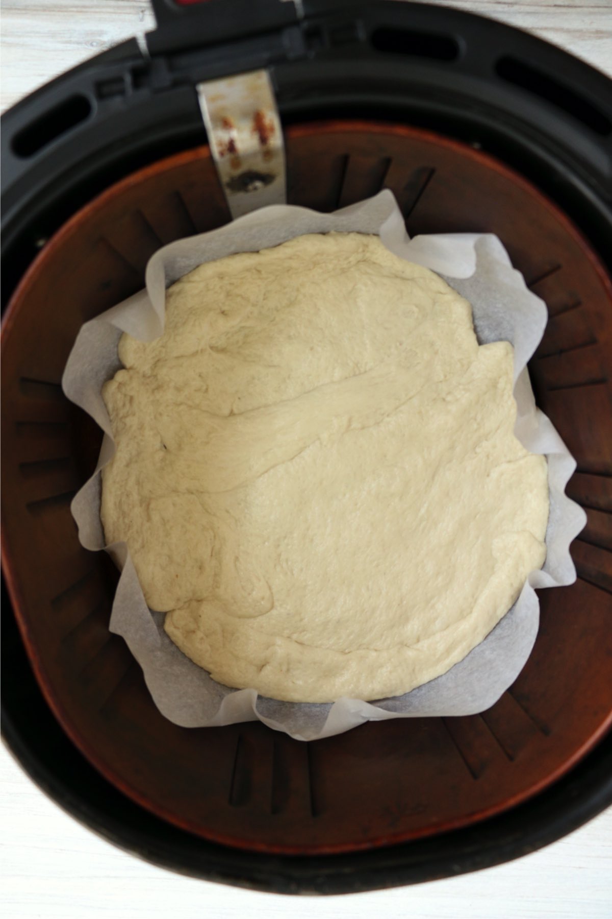 - After opening the pizza crust dough, cut it in half. Press half of the dough into the prepared air fryer basket.
