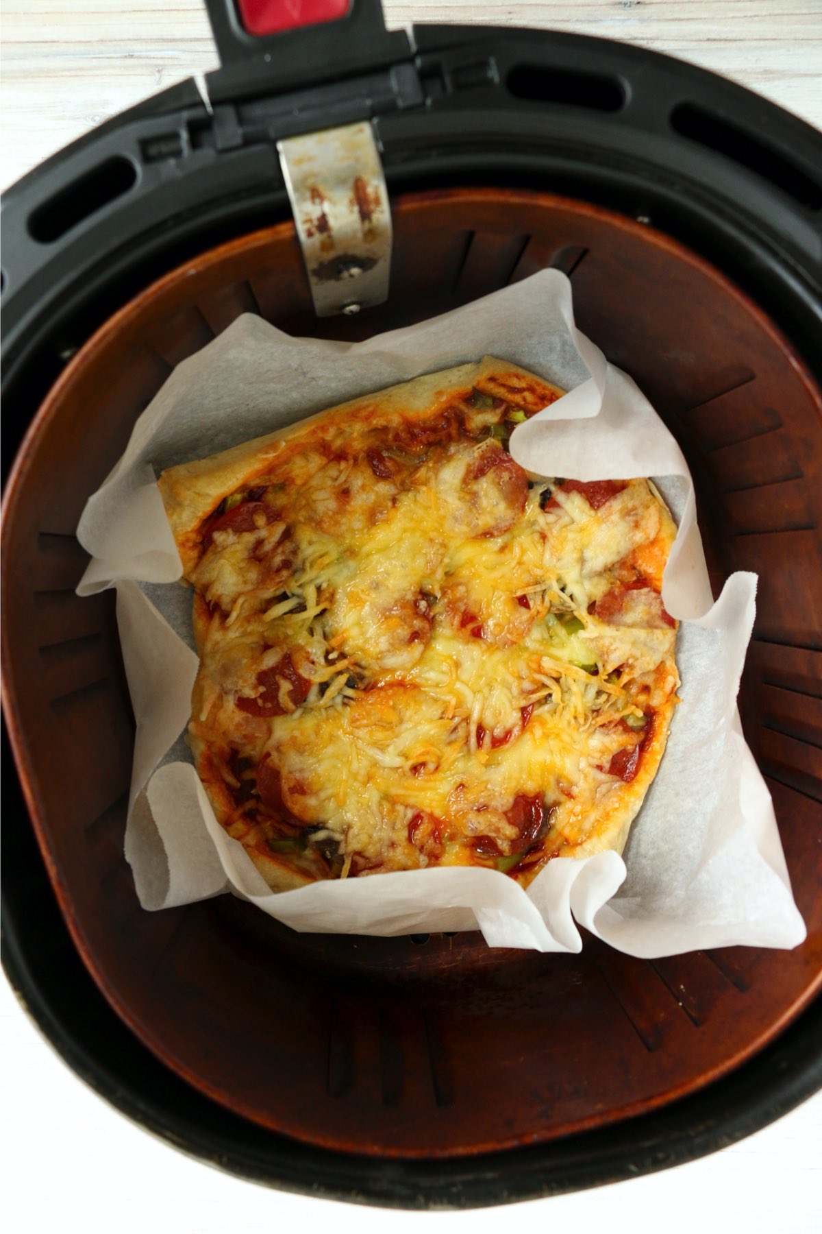This easy, delicious air fryer pizza uses refrigerated pizza crust and all your favorite toppings to create a classic pizza that cooks up with a golden crust and perfectly melted toppings every time.