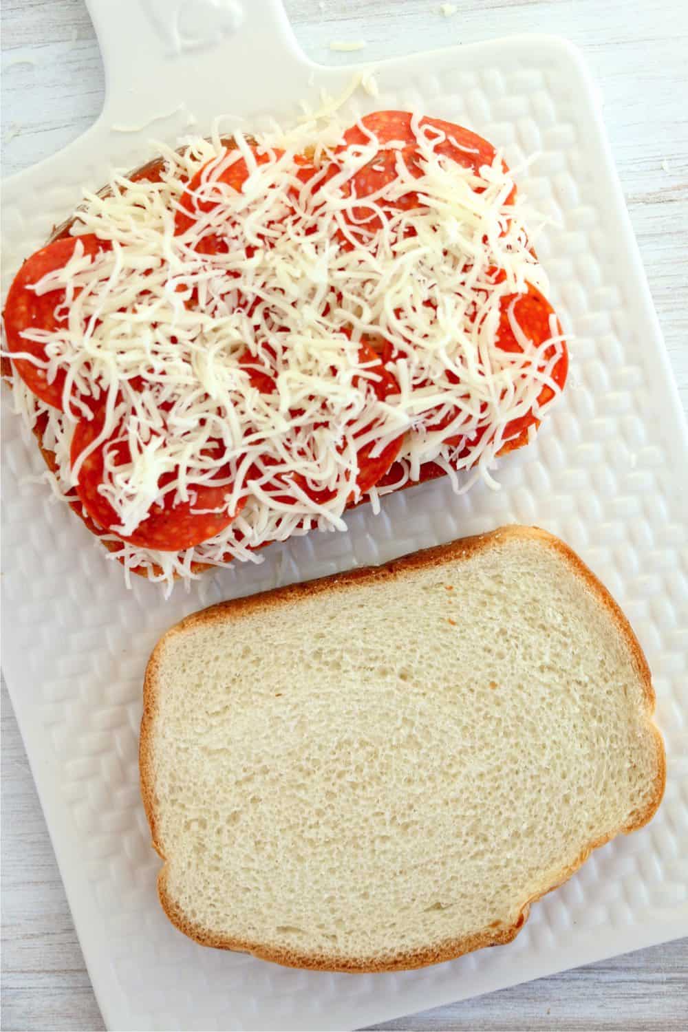 - On the same two pieces of bread, place one layer of a 1/4 cup of cheese, 6 slices of pepperoni, and then another layer of 1/4 cup of cheese.