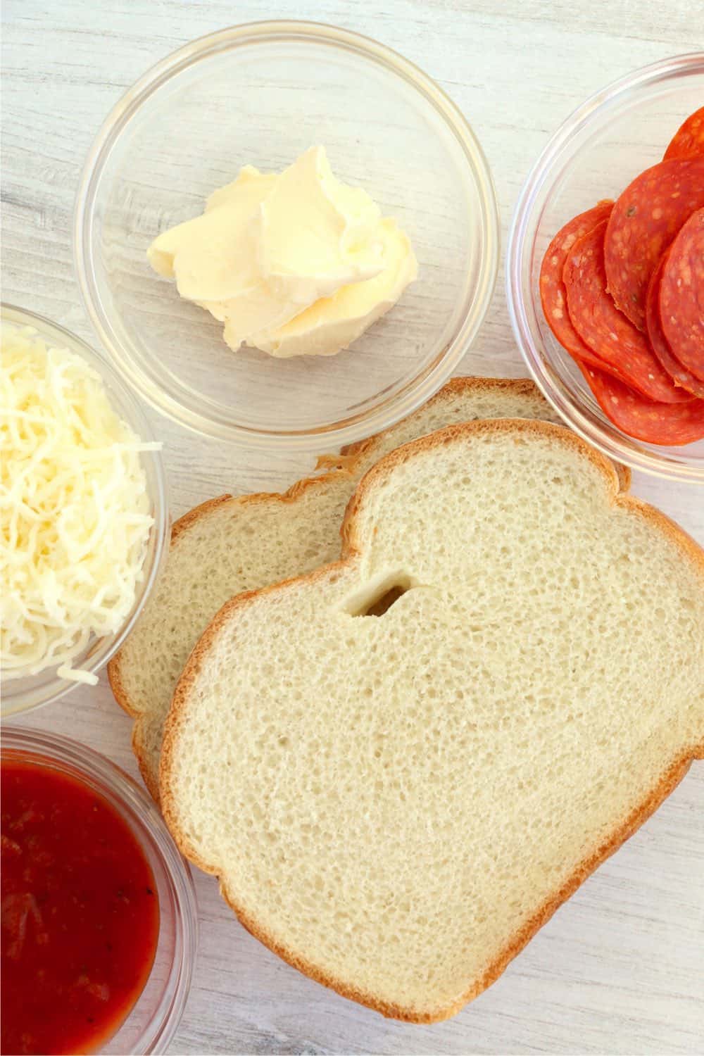 Lay the pieces of bread butter side down. Spread half of the pizza sauce on two of the pieces of bread.