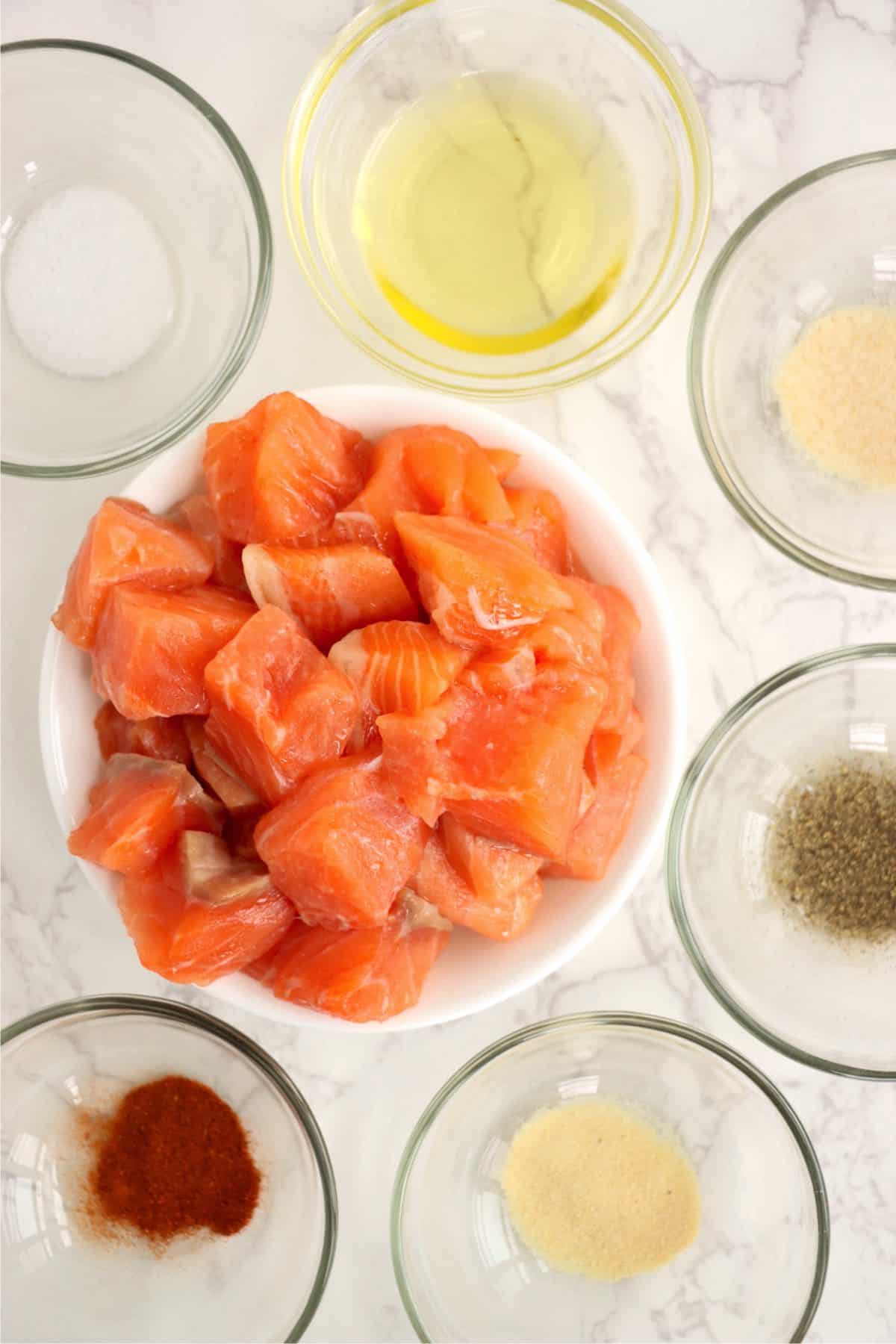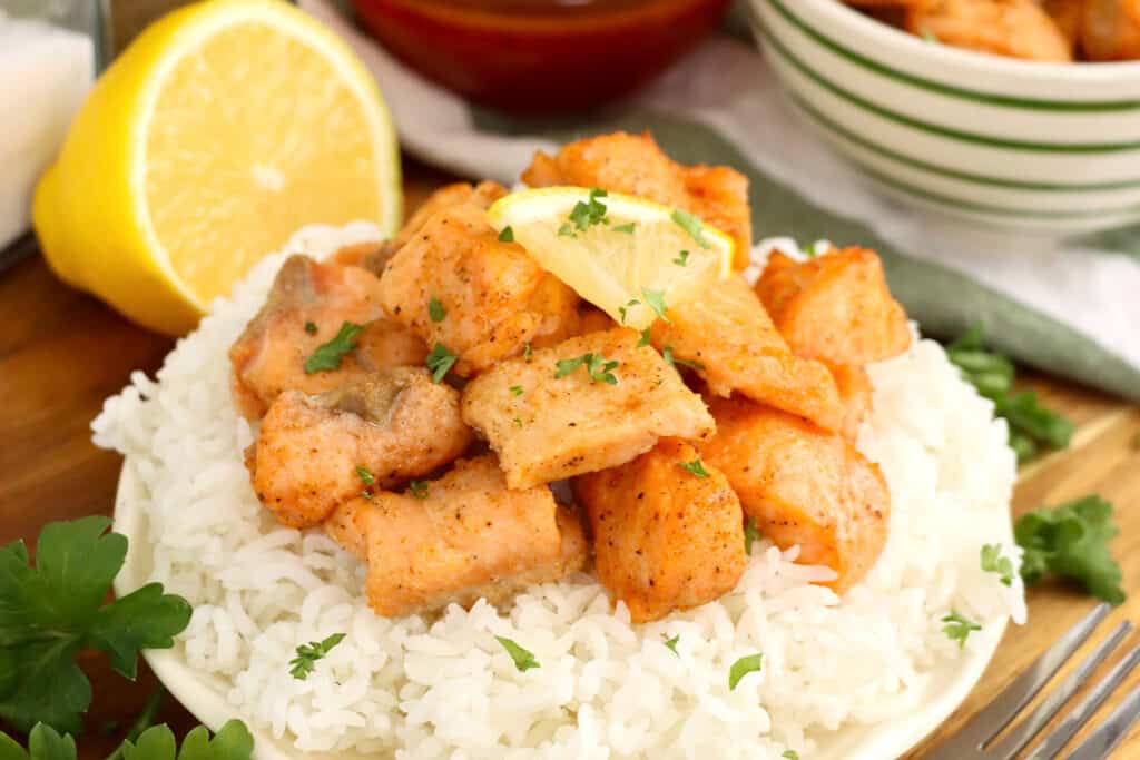 - Pat your salmon bites dry with paper towels before tossing them with the seasoning for an even coating.