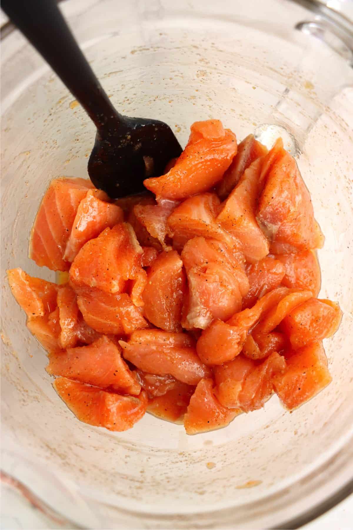 2: Add salmon chunks to the bowl and stir until well-mixed.