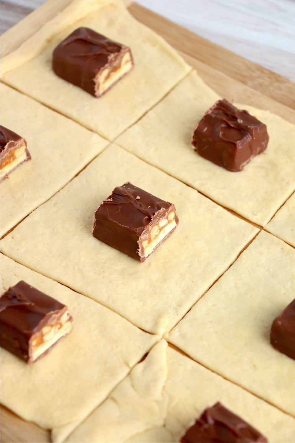- Wrap each piece of Snickers in each square of dough. Pinch the ends together, making sure it is completely sealed.