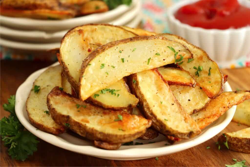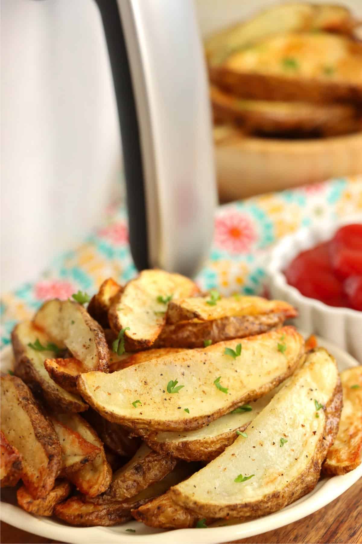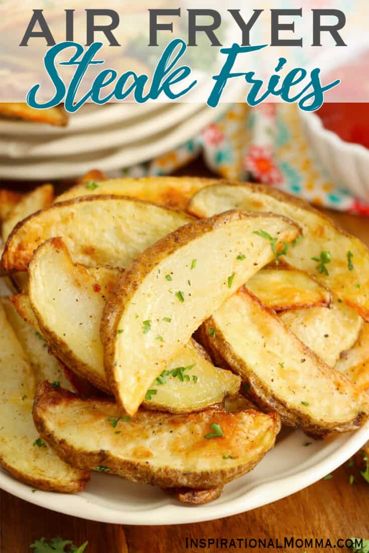 Air fryer steak fries are crispy on the outside and soft on the inside. These perfectly seasoned potato wedges make the perfect side for all your favorite sandwiches, burgers, dogs, and other favorites like chicken nuggets.