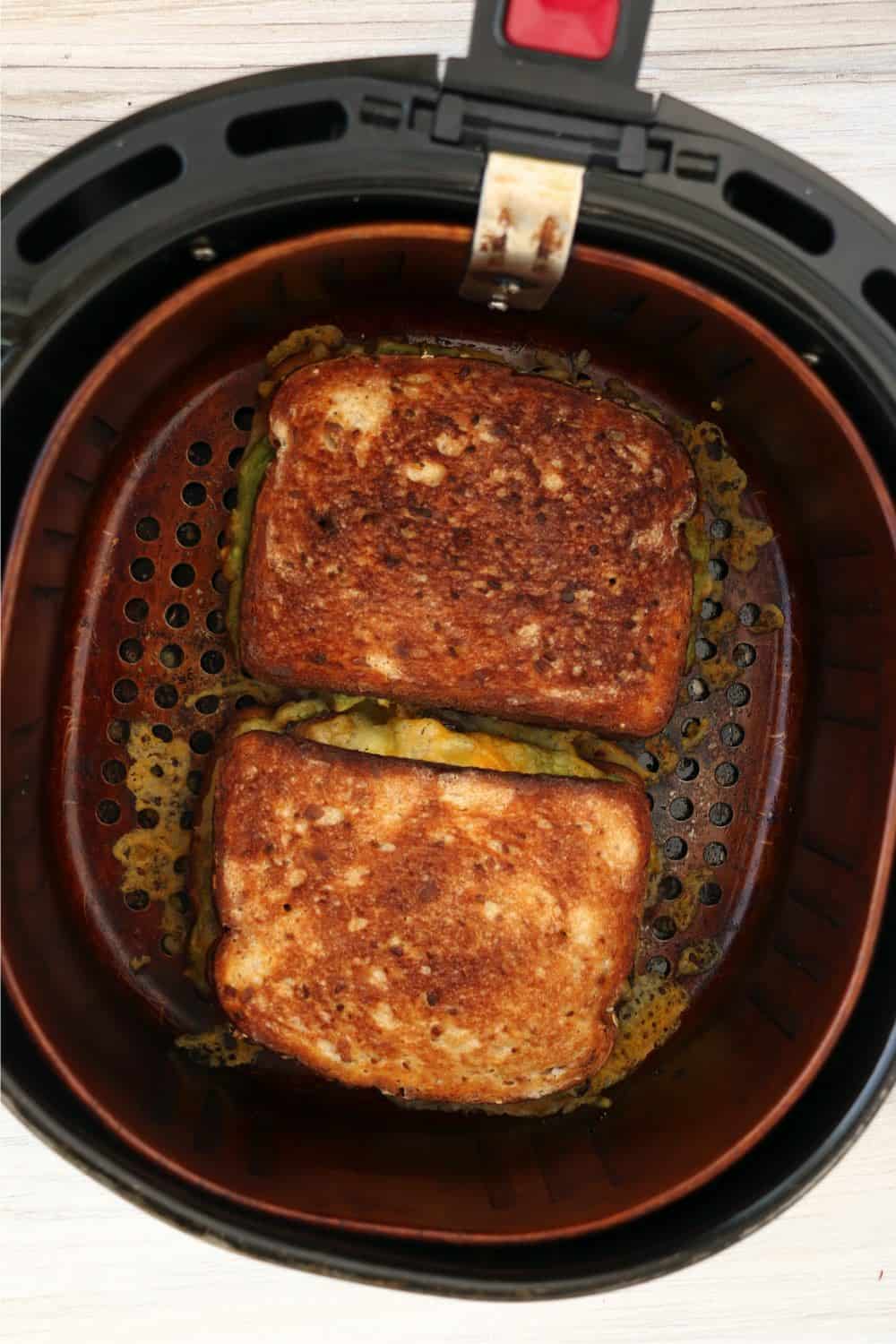The air fryer to the rescue! It makes perfectly crisp sandwiches without any of those problems. The melted cheese also had no chance of sticking. This sandwich cooks in 5 minutes total. That includes the prep time for bread and cooking bacon.