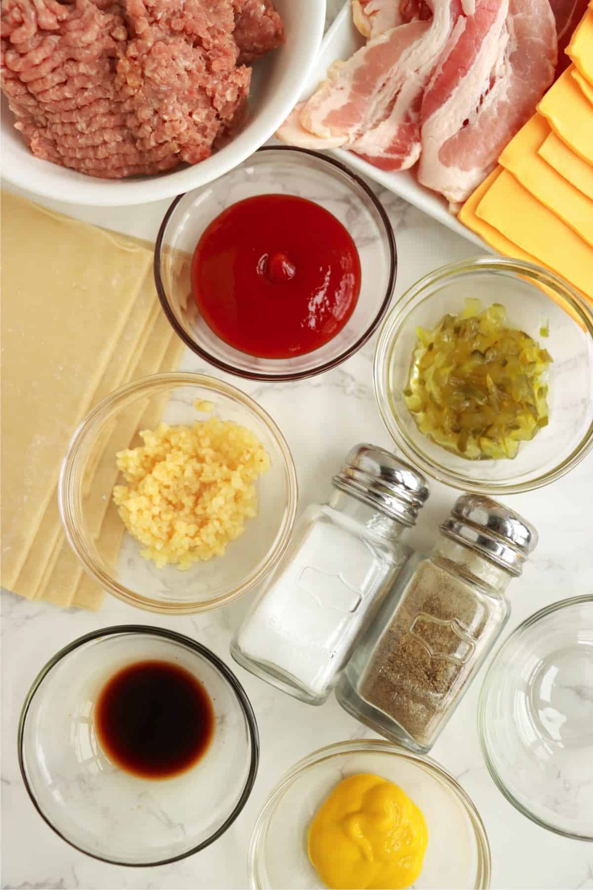 This recipe uses all the ingredients you'd normally need for a bacon cheeseburger. The only thing different is shopping for egg roll wrappers instead of buns. The main ingredients are listed here, but you'll find the exact list of ingredients along with amounts in the recipe card at the end of the post.
