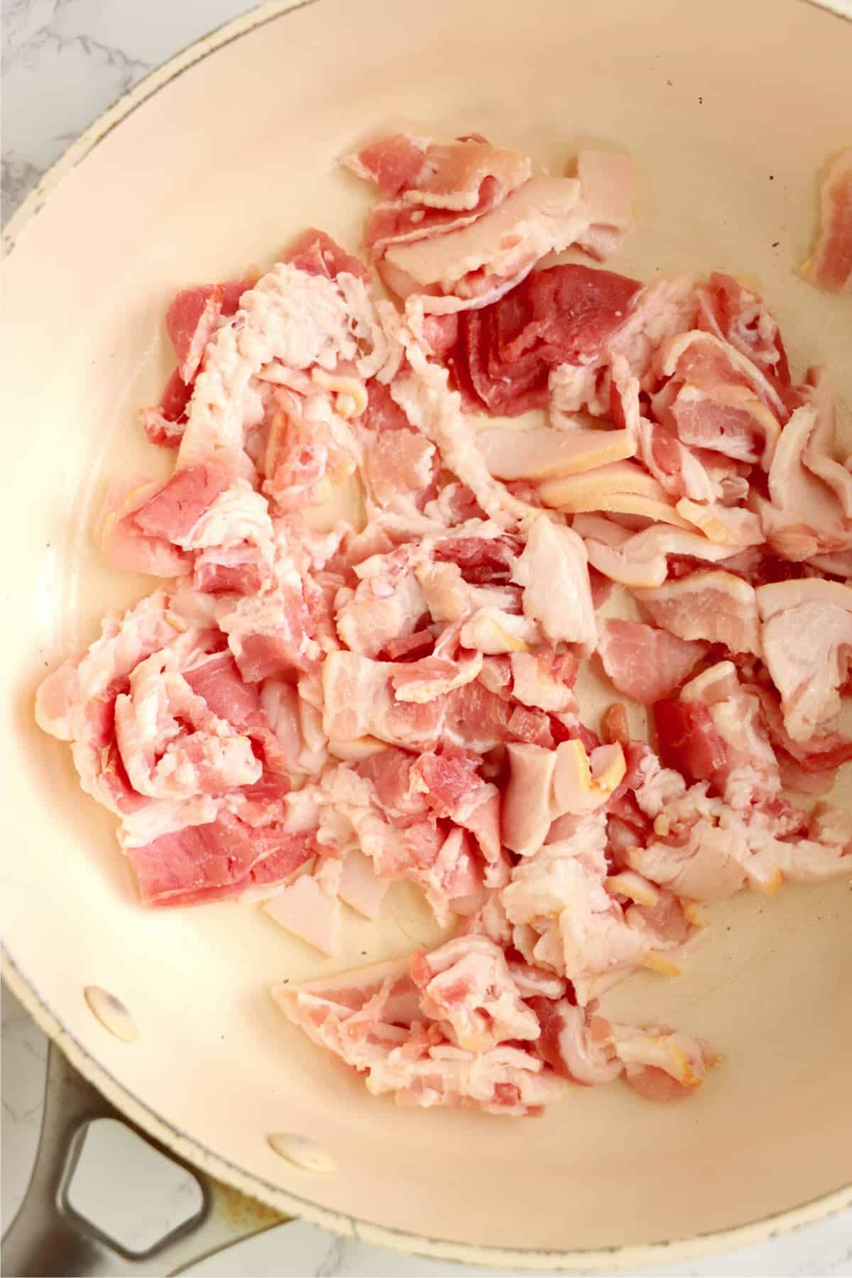 - Add bacon to a large skillet and fry on medium-high heat until cooked and crispy.