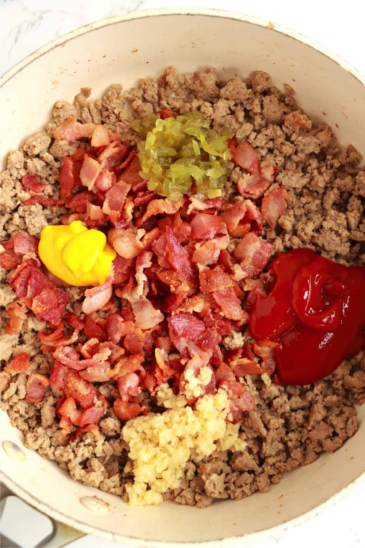 - Add bacon, garlic, ketchup, mustard, relish, and Worcestershire sauce. Stir together and cook for an additional 2 minutes. Remove meat mixture from heat and allow to cool a bit before assembling your egg rolls. If the meat mixture is too hot, it will cause your egg roll wrappers to tear.