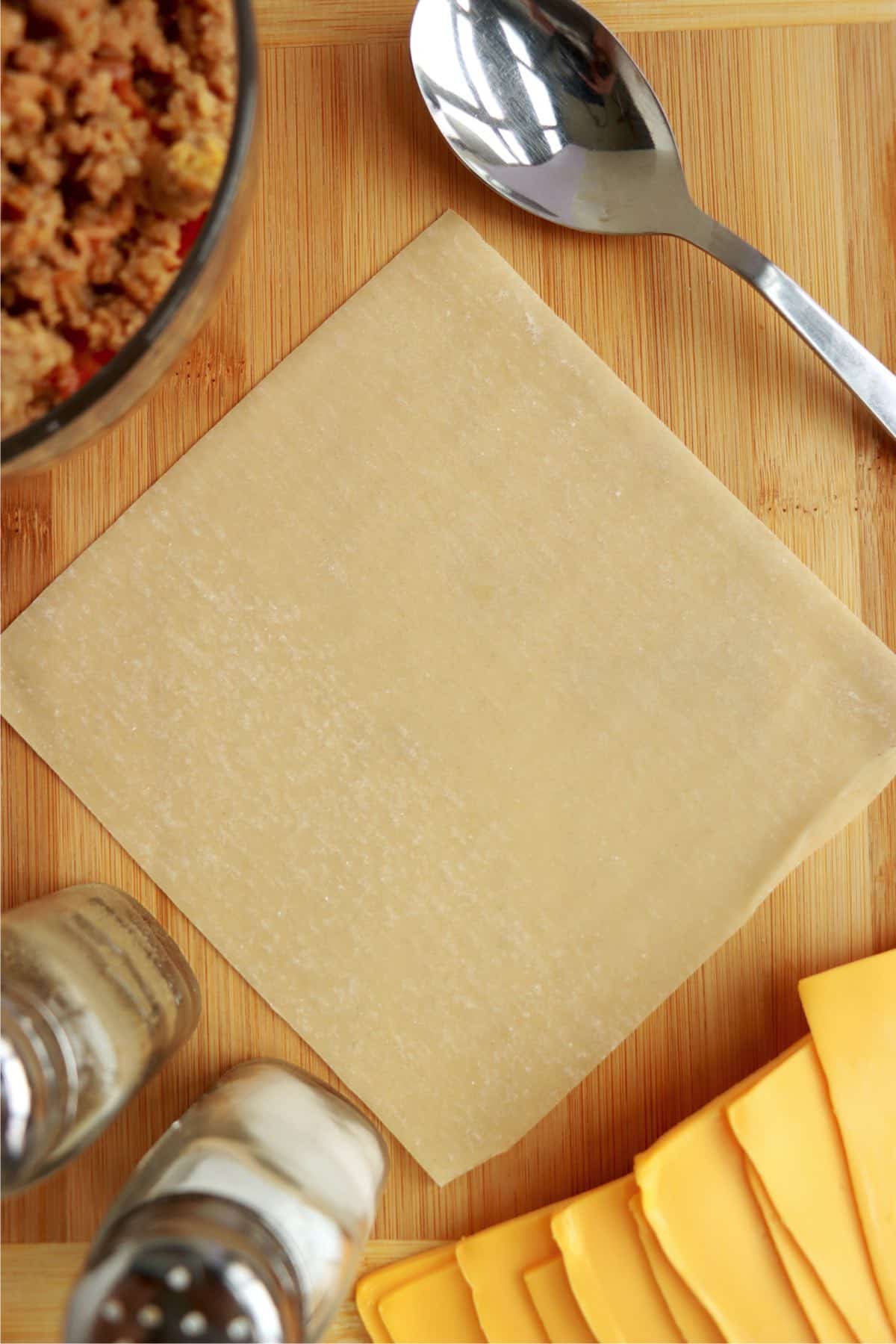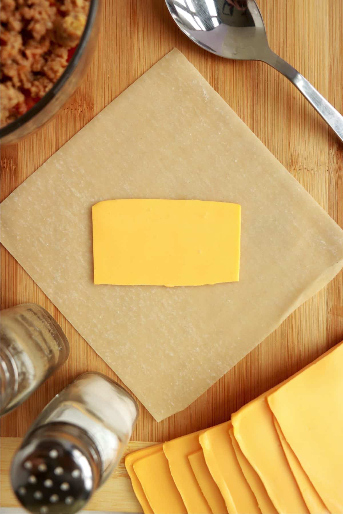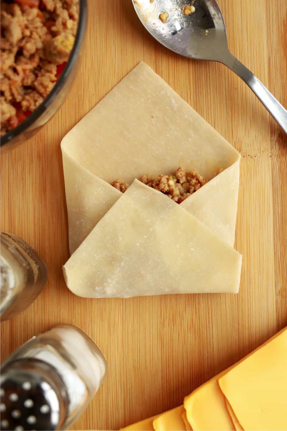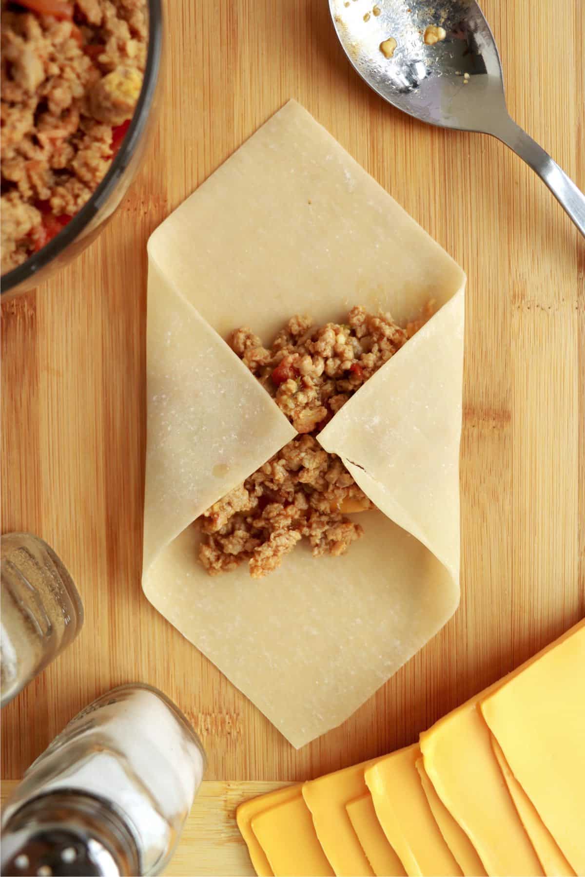 4: A cheese and the ground meat mixture to the egg rolls and wrap them up. Dab the corners with a bit of water to seal.