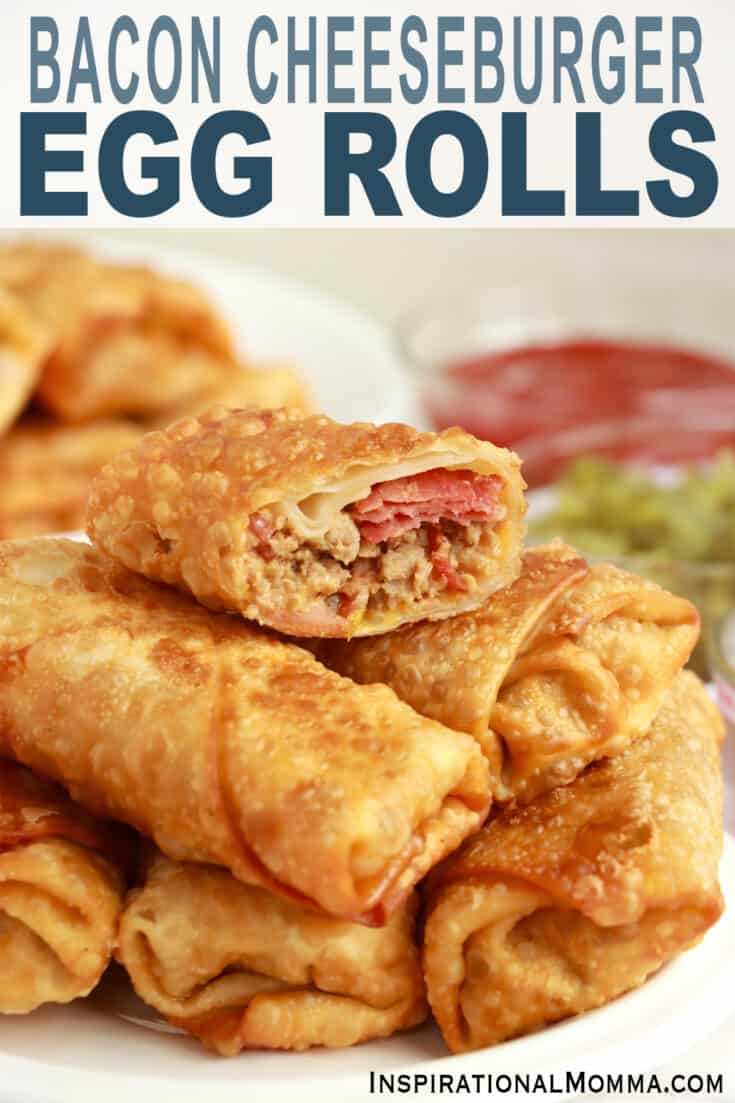 These bacon cheeseburger egg rolls take egg roll wrappers, stuff them with everything we love about bacon cheeseburgers, then fries them to golden brown perfection to create a crispy egg roll with bacon cheeseburger flavor in every bite.