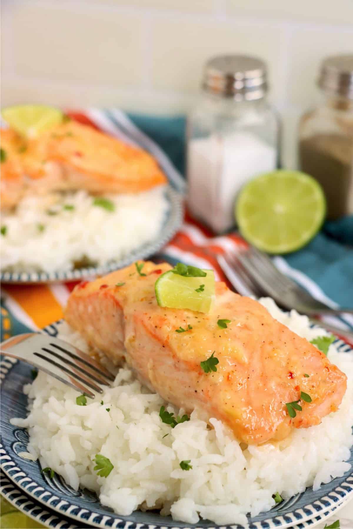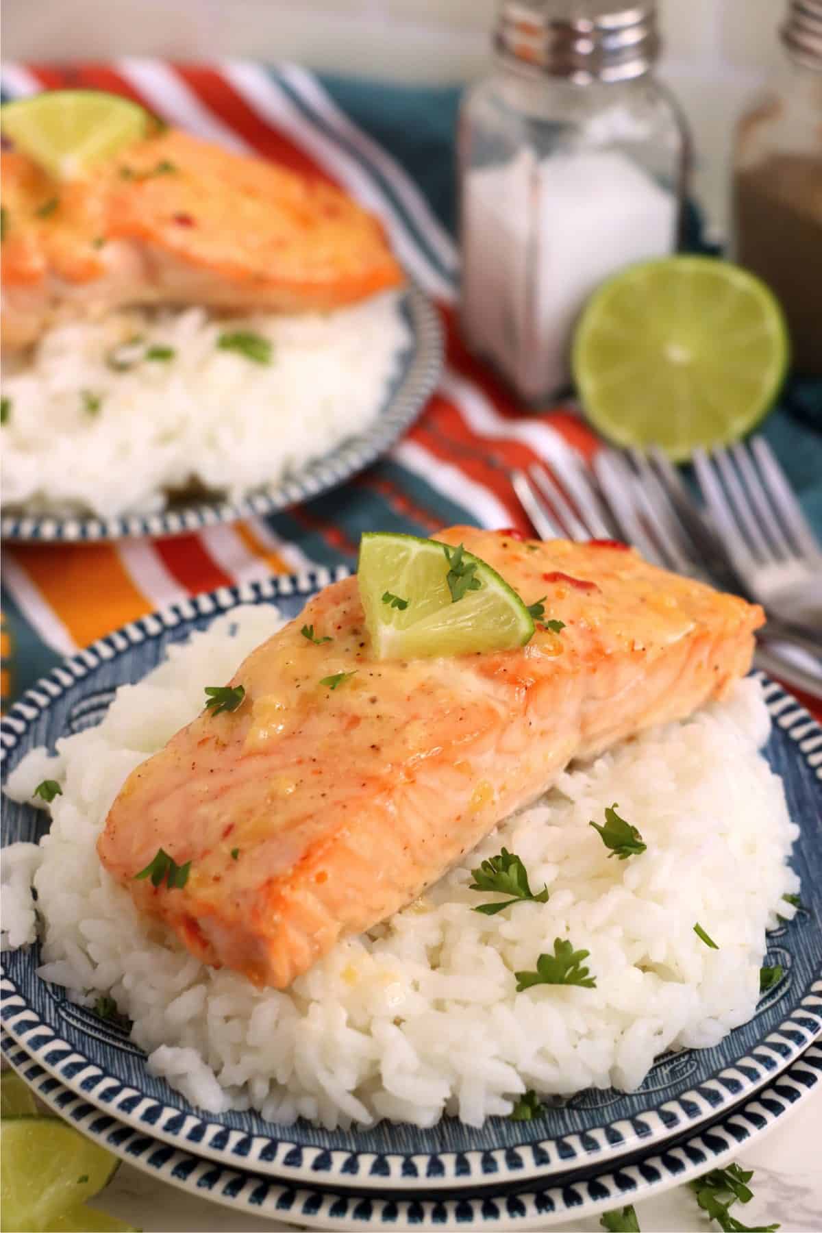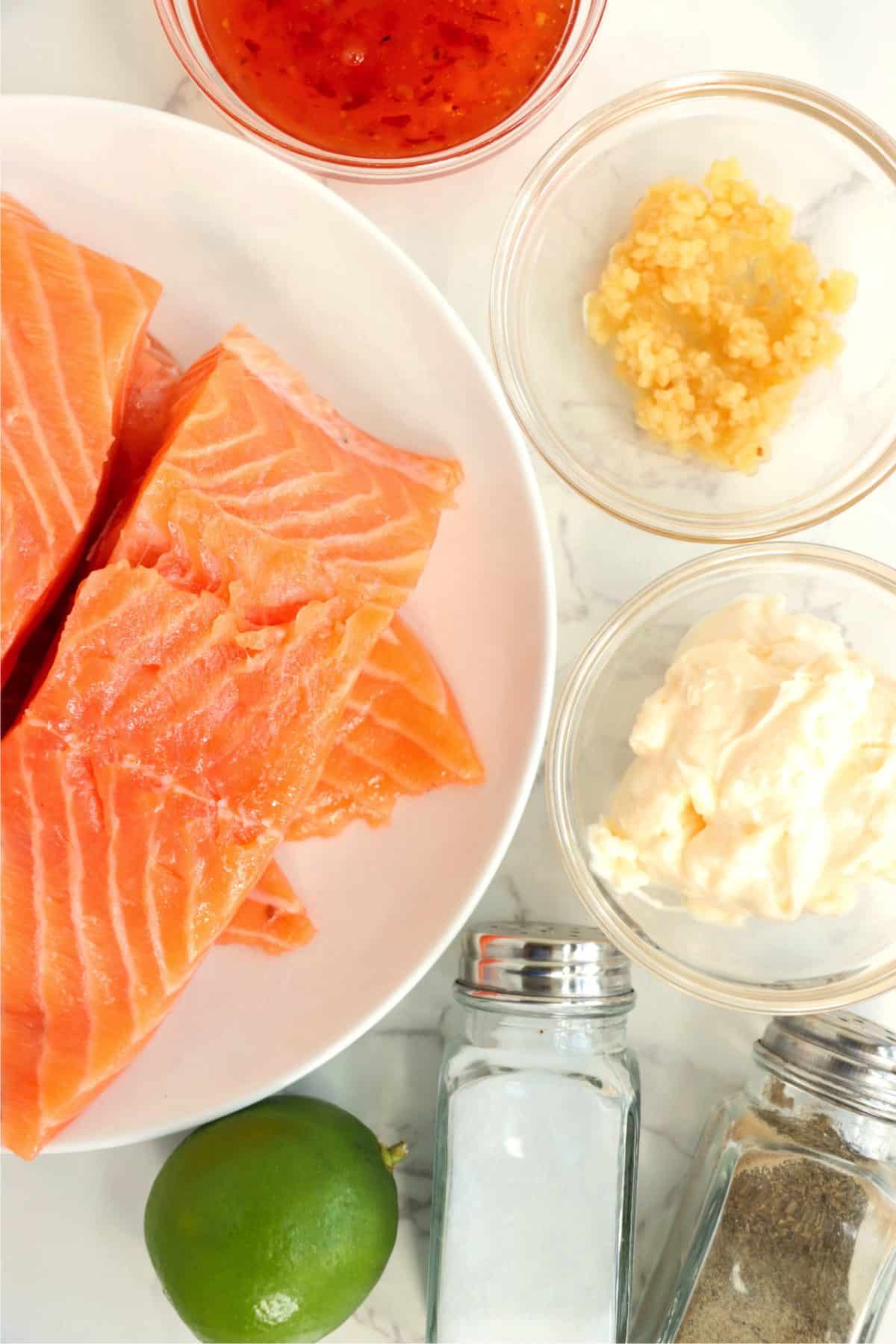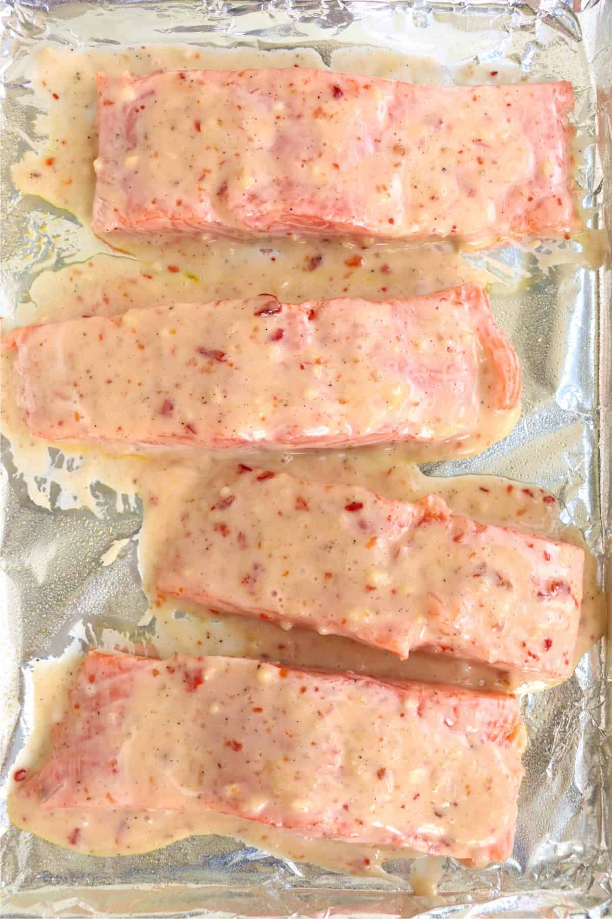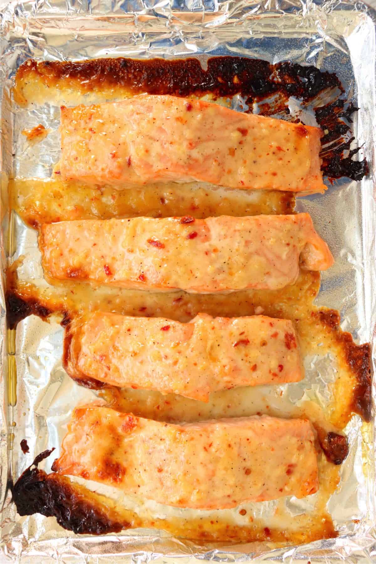 This baked salmon with mayonnaise takes fresh salmon filets and coats them in a rich, sweet, and spicy glaze made with mayonnaise, sweet chili sauce, garlic, and lime. It's a delicious, versatile fish dish everyone will love.
