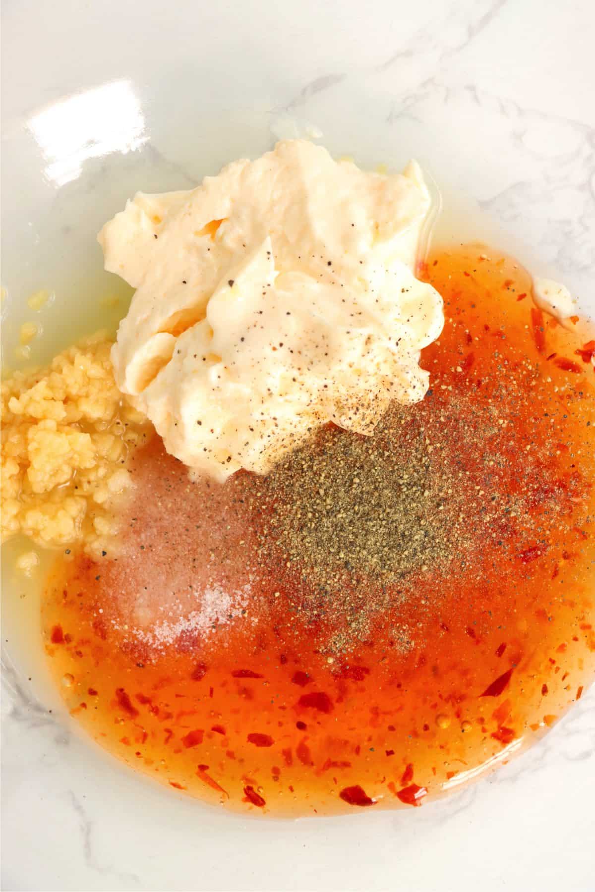 - In a medium bowl, combine mayonnaise, sweet chili sauce, minced garlic, lime juice, salt and pepper. Mix well.
