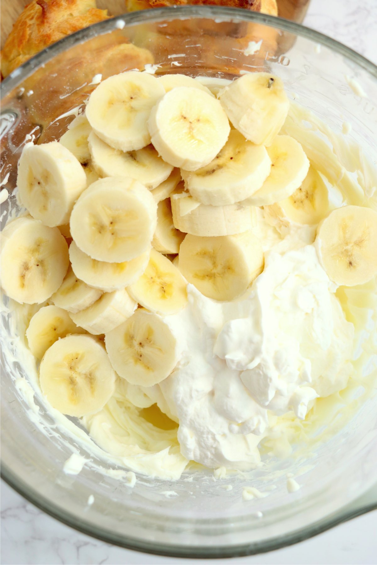 5: Beat heavy whipping cream until stiff peaks form, then fold the whipped cream and sliced bananas into the cream cheese mixture.