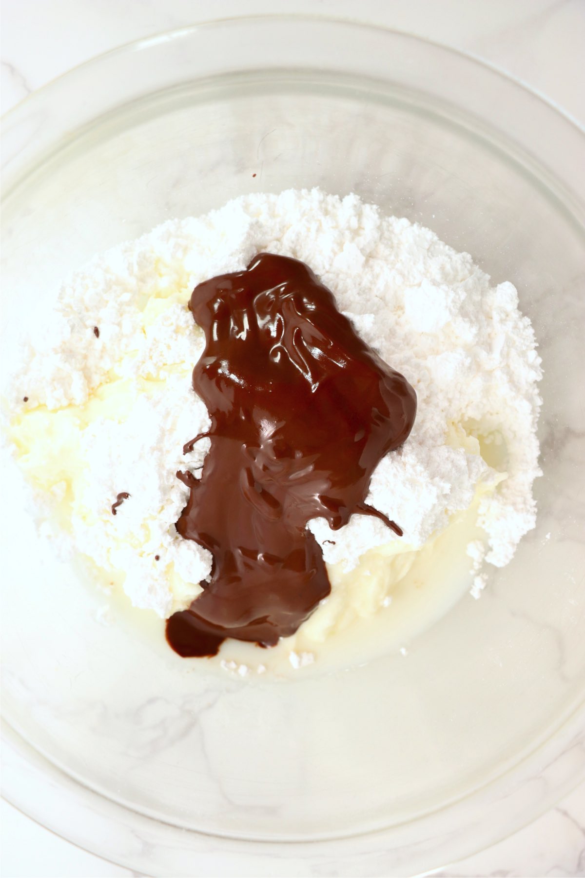 - To make chocolate ganache topping, add remaining sugar, melted chocolate, and milk to ½ cup of cream cheese mixture. Mix well.