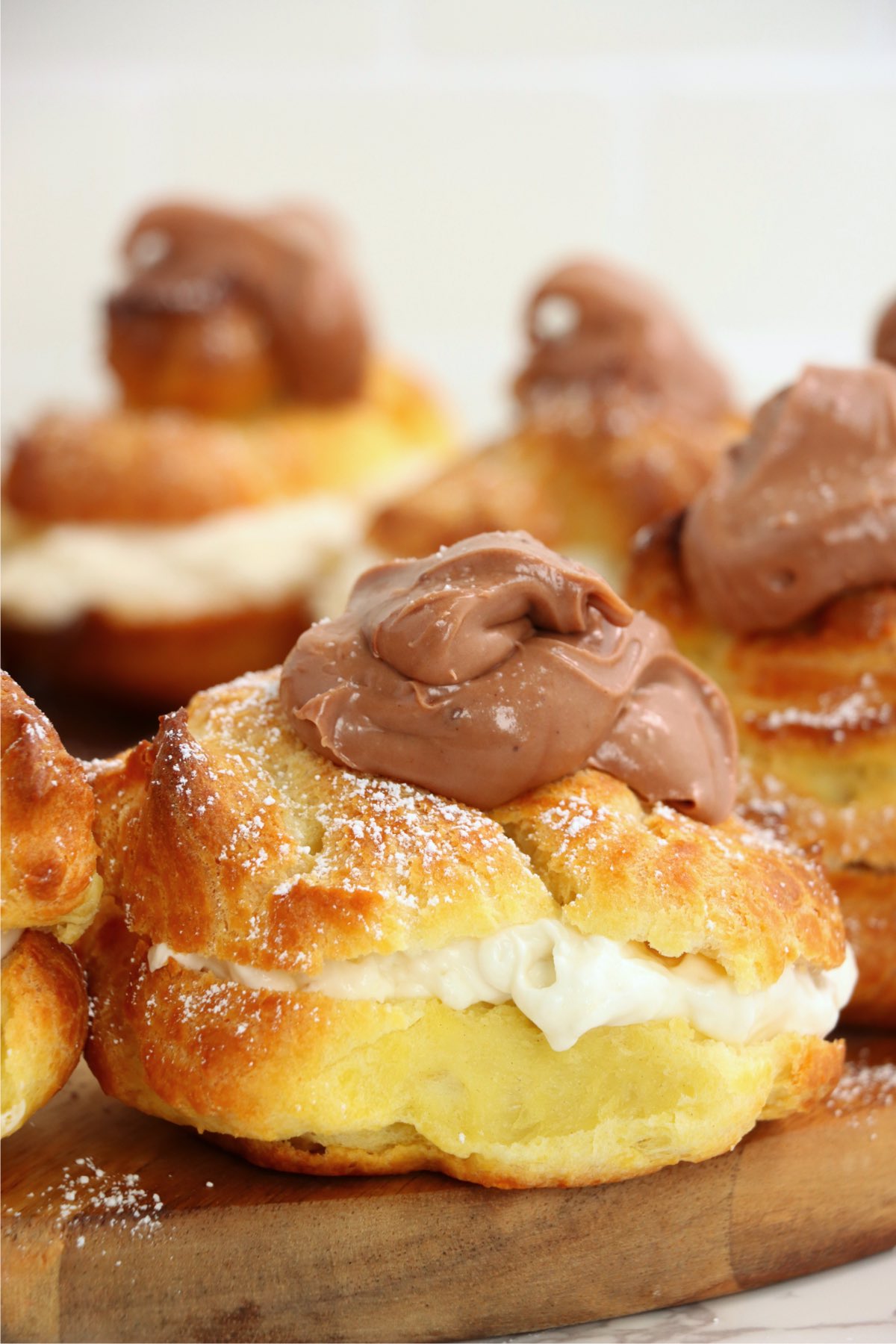 - Place a scoop of chocolate ganache on top of each cream puff.