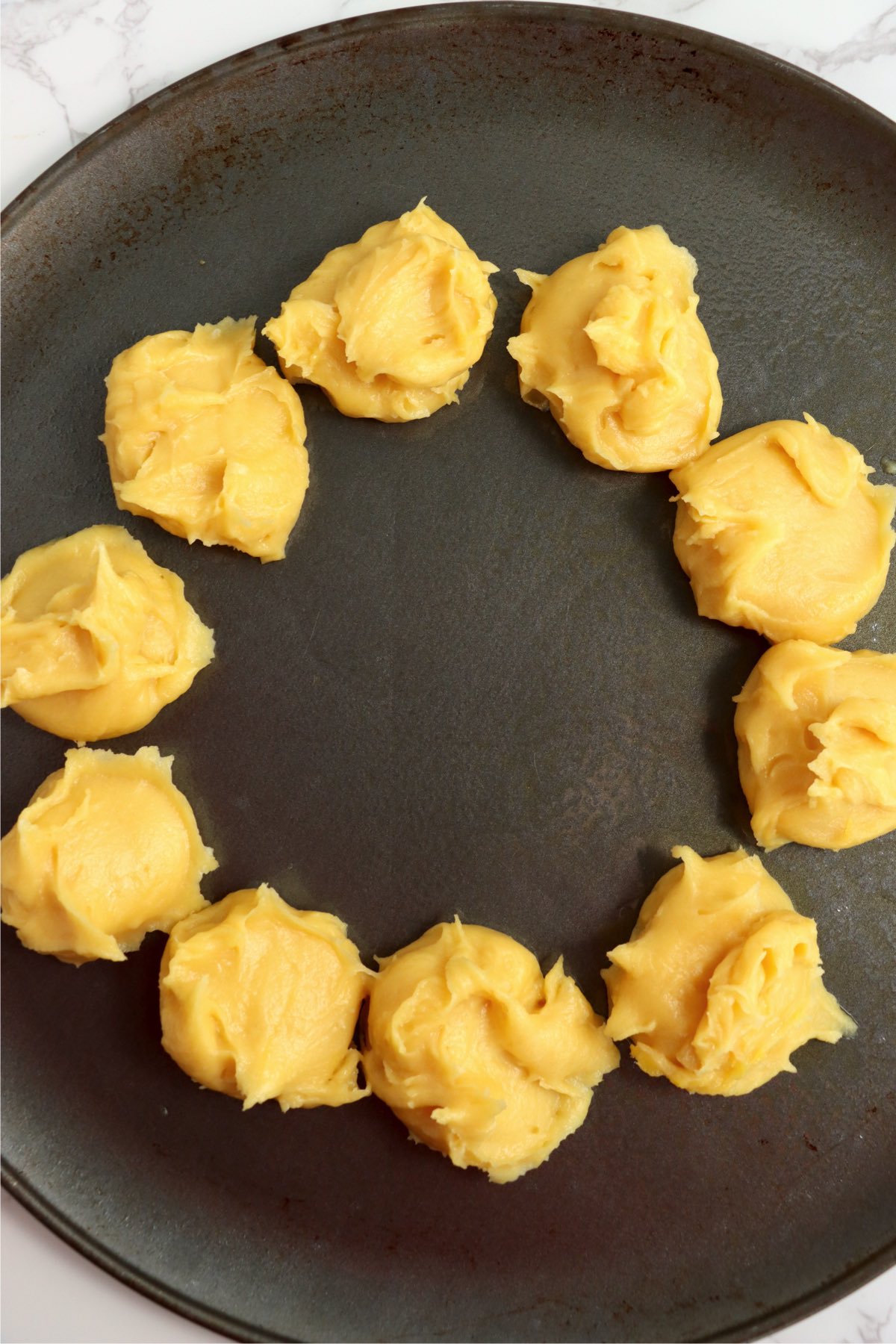 - Drop ten ½ cupfuls of dough on lightly greased baking sheet to form a 9-inch ring.