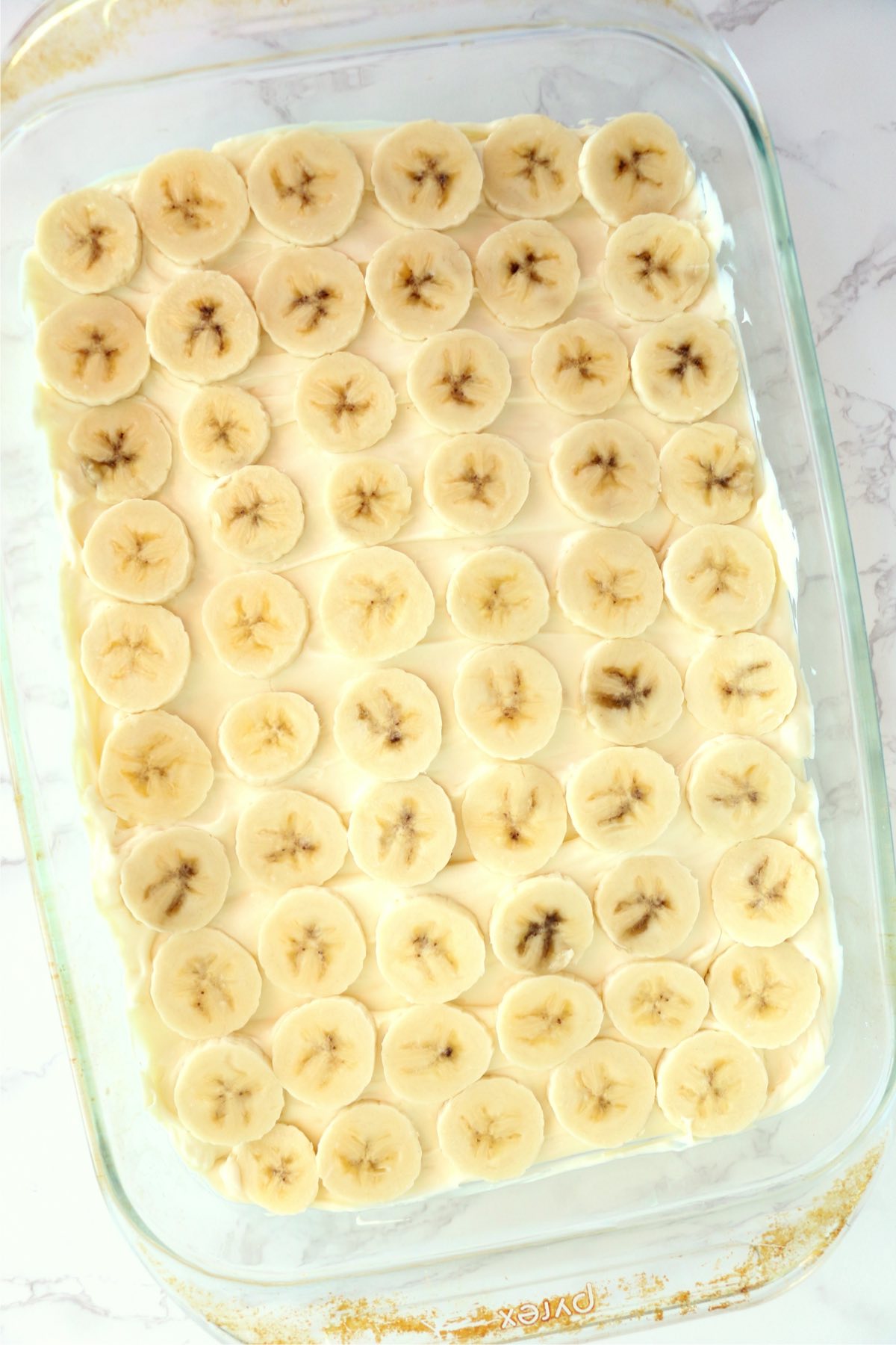 5: Spread half the mixture over the crust. Then, add a layer of bananas and a layer of whole vanilla wafers.