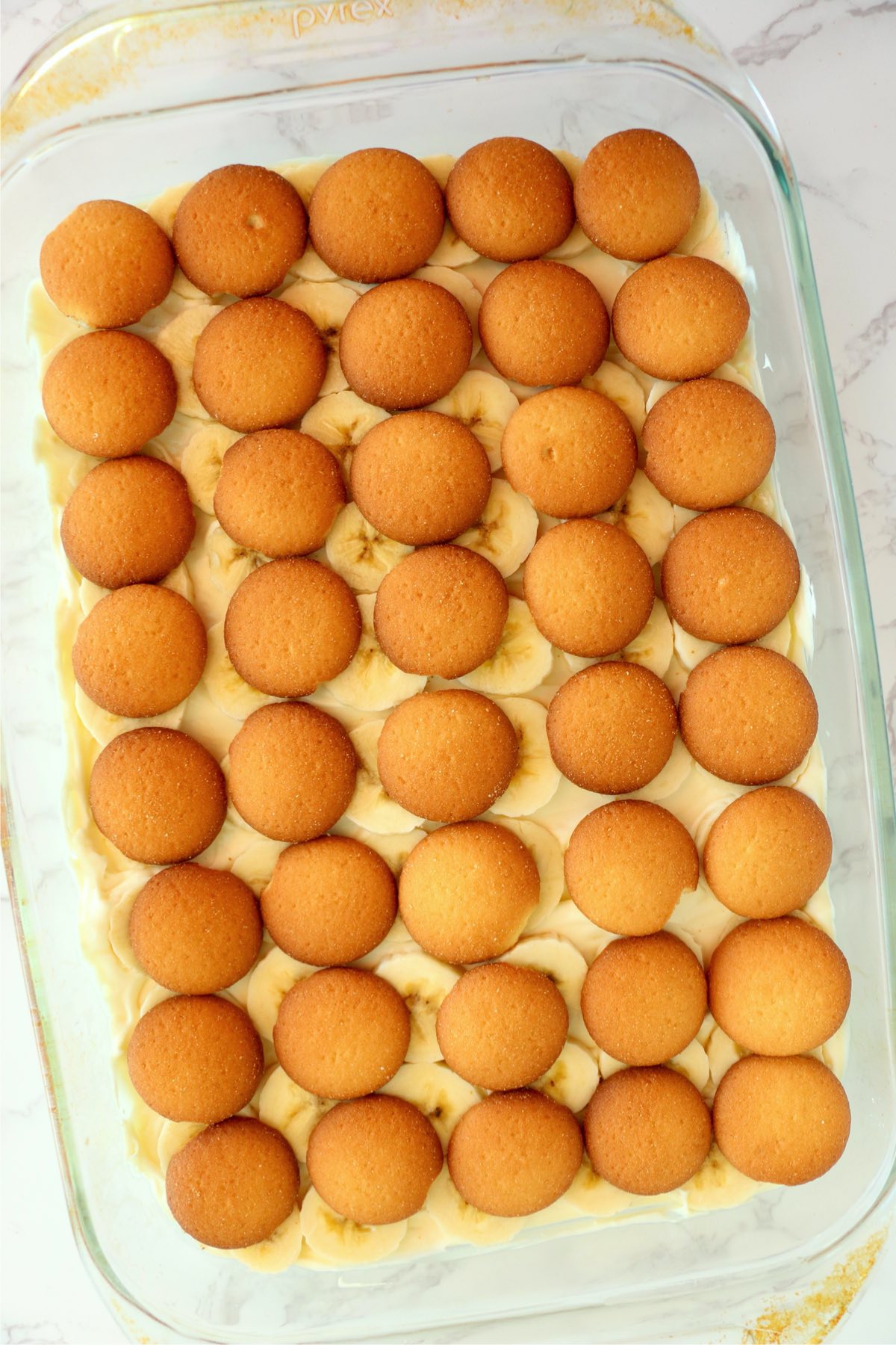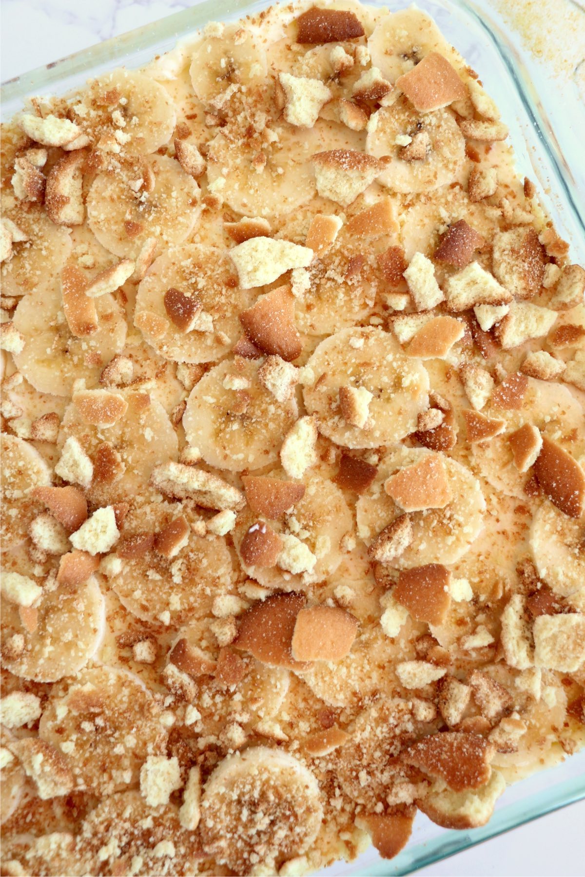 - Crush the remaining vanilla wafers into smaller chunks and sprinkle them over top of banana layer.