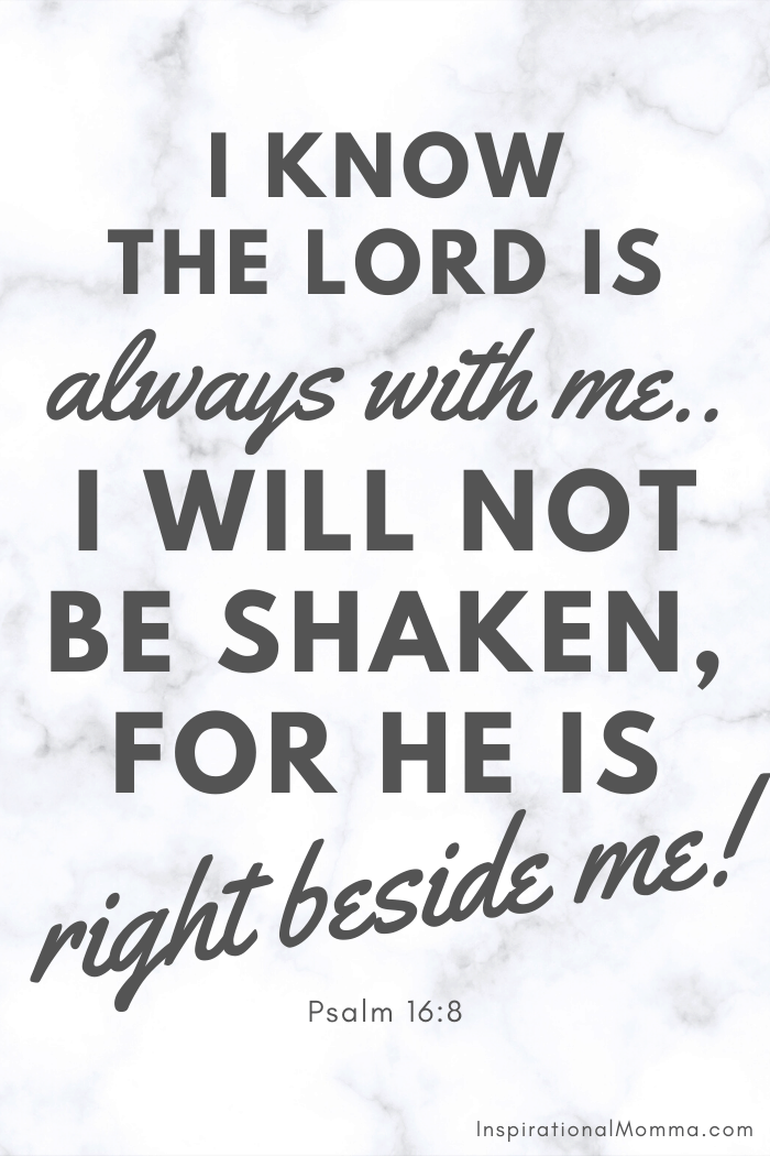 I know the Lord is always with me. I will not be shaken, for He is right beside me. Psalm 16:8
