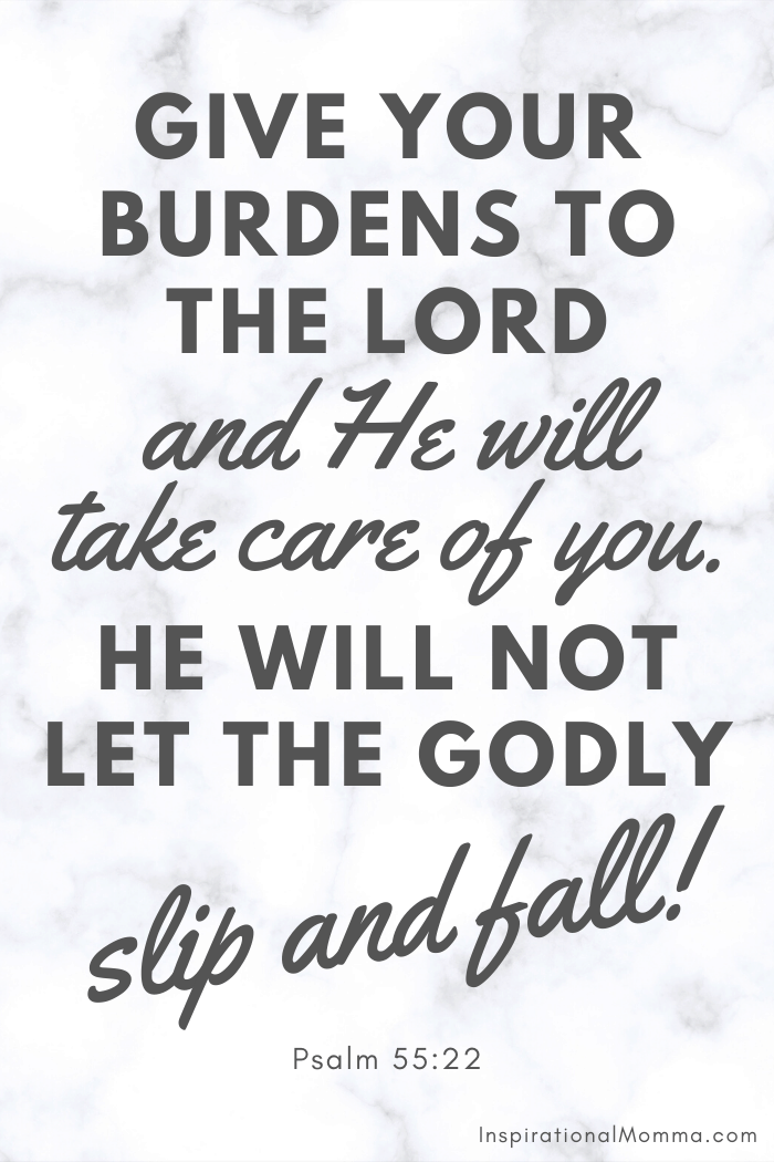 Give your burdens to the Lord, and He will take care of you. He will not let the Godly slip and fall. Psalm 55:22