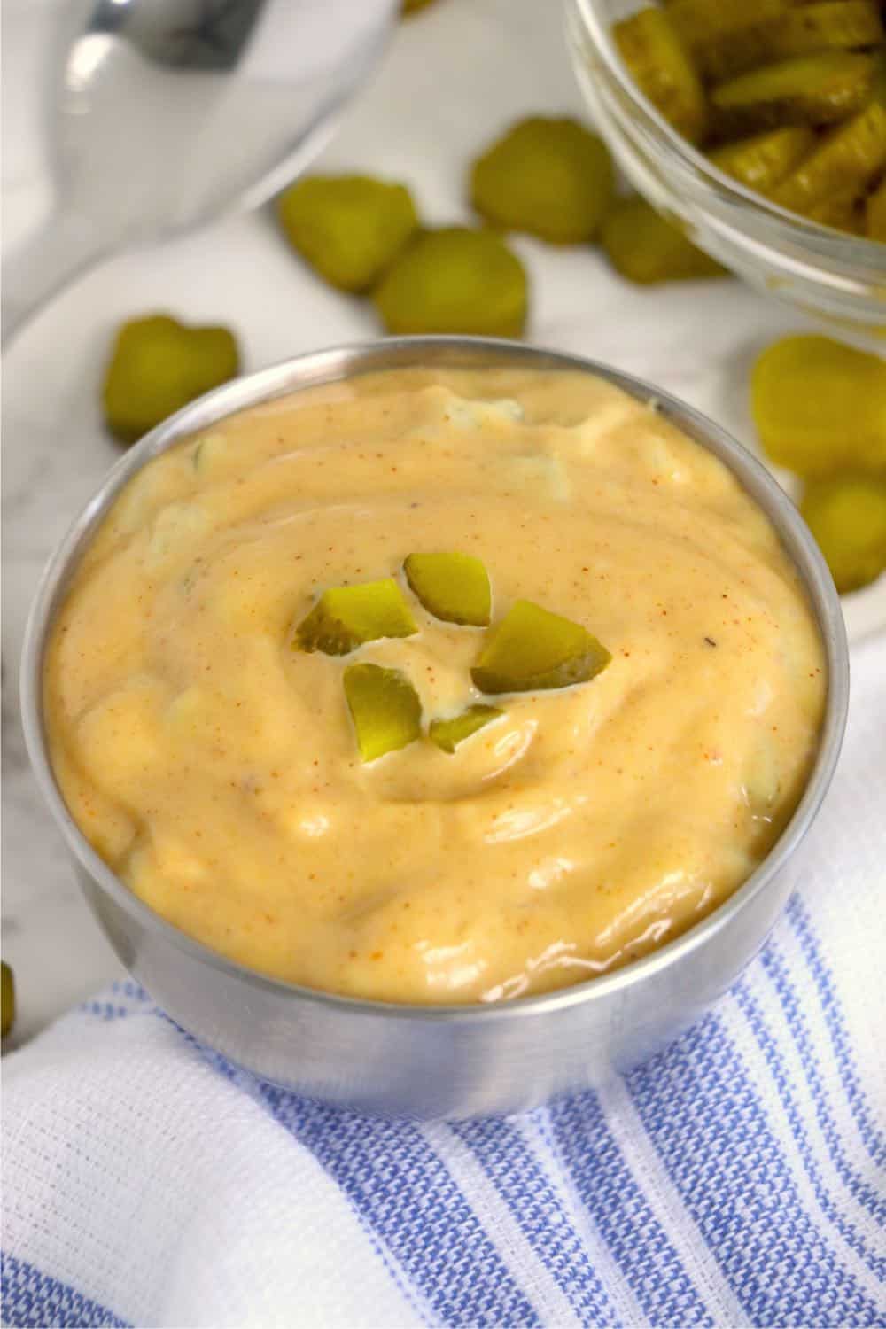 My Big Mac sauce is made with mayo, pickles, sugar, mustard, garlic powder, onion powder, and a couple of other ingredients to mimic the sweet, tangy flavor of Big Mac secret sauce.