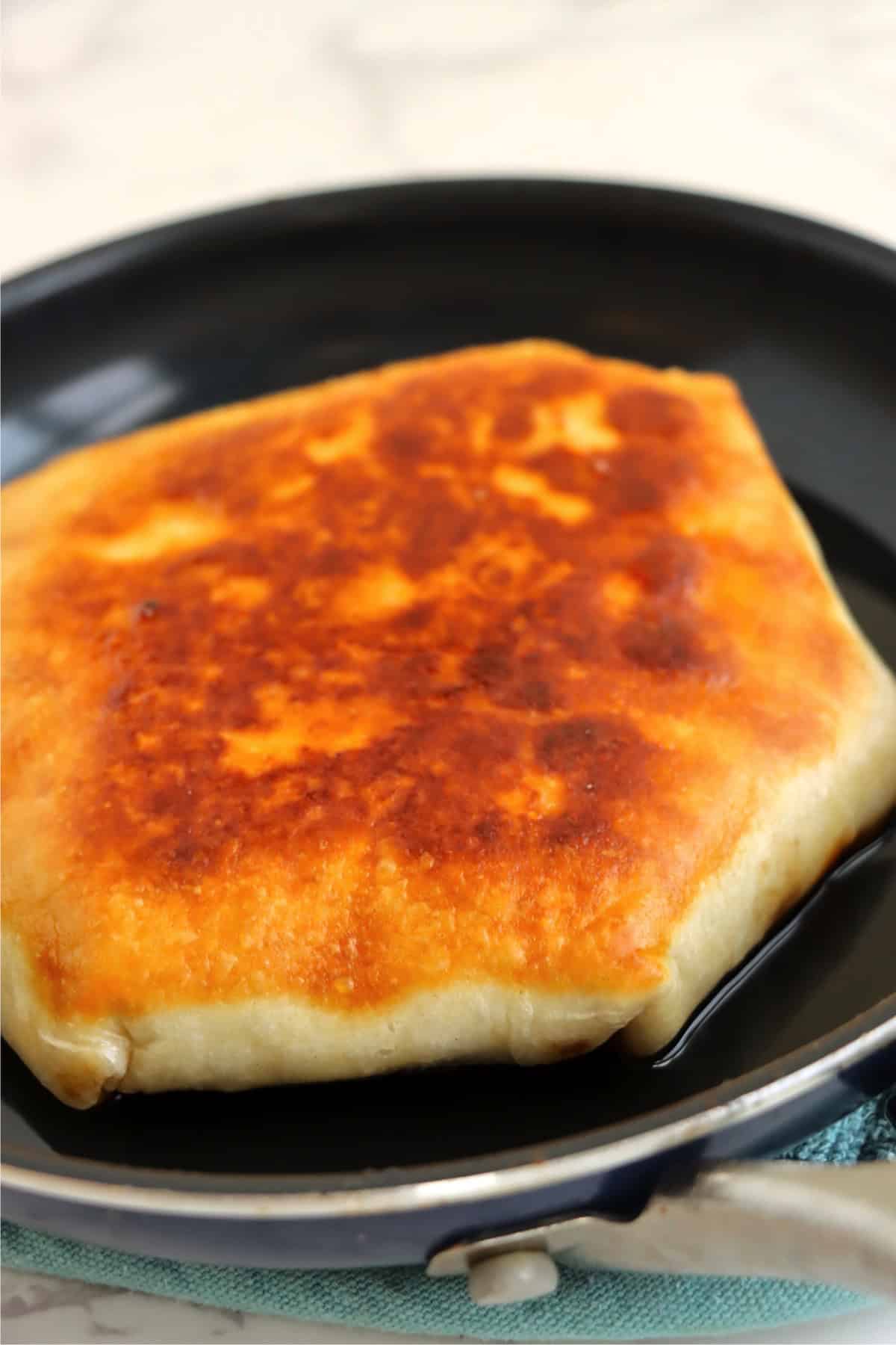 - Heat ½-inch vegetable oil in a medium skillet over medium heat. Place crunch wrap folded side down in the heated skillet.