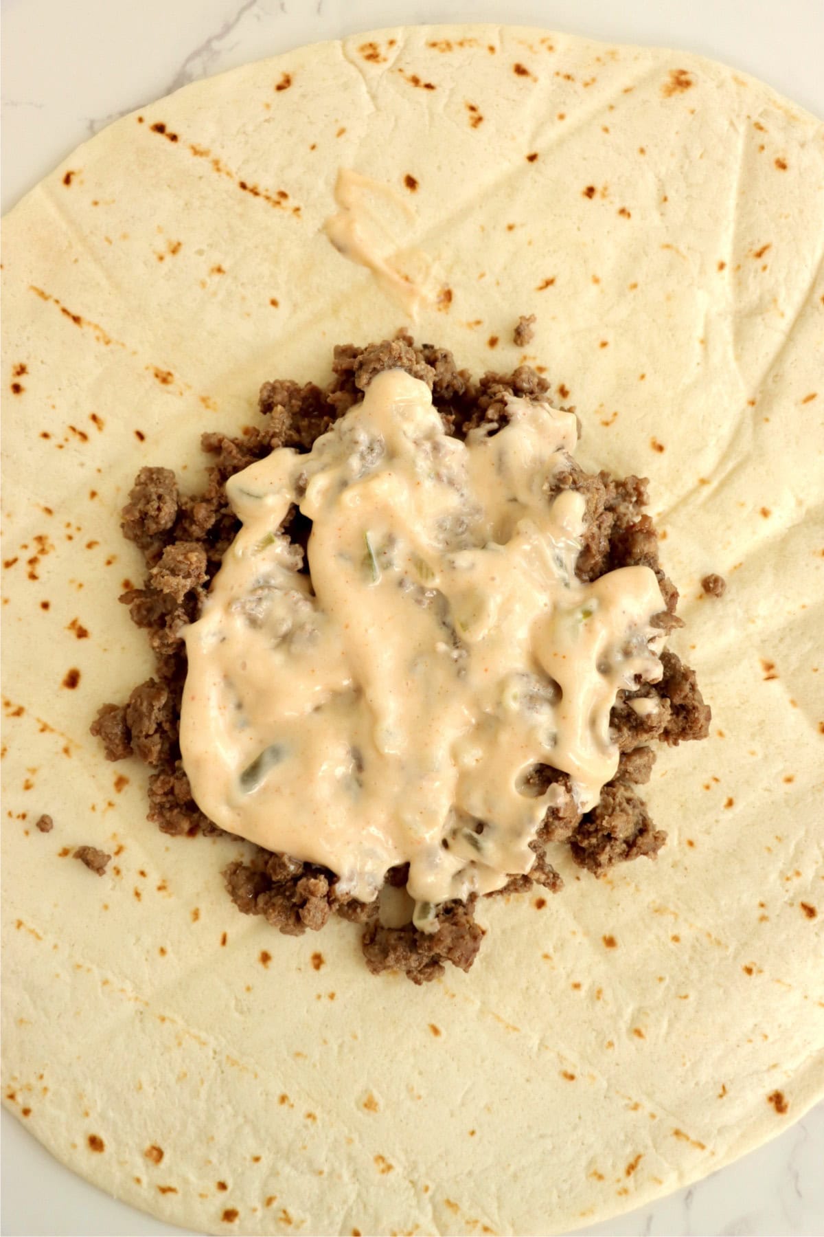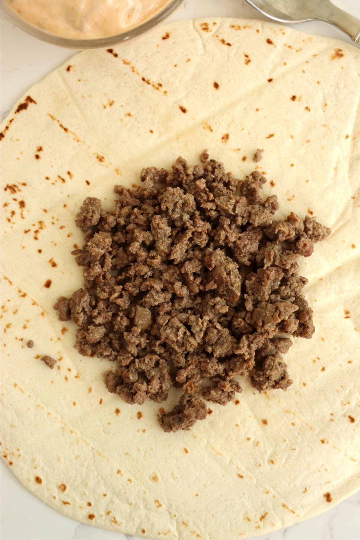 - Lay large tortillas on a flat surface. Spoon ¼ of the ground beef onto each tortilla. Spread it out to about the size of a tostada shell.
