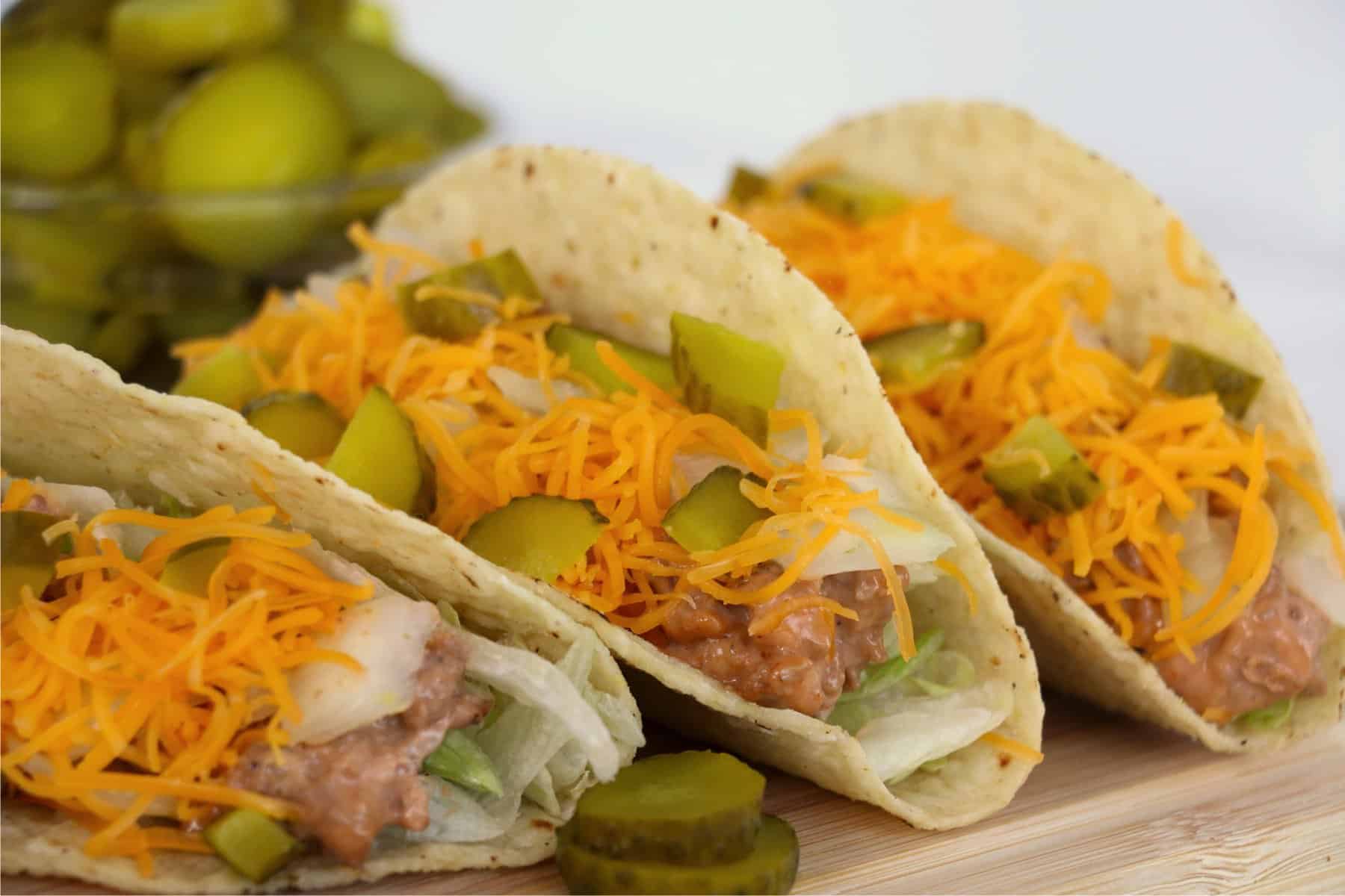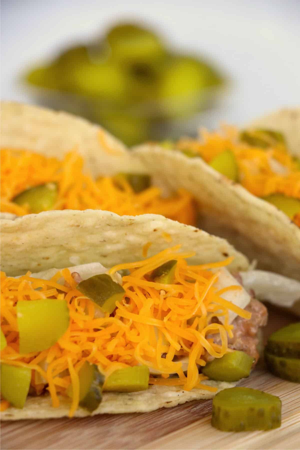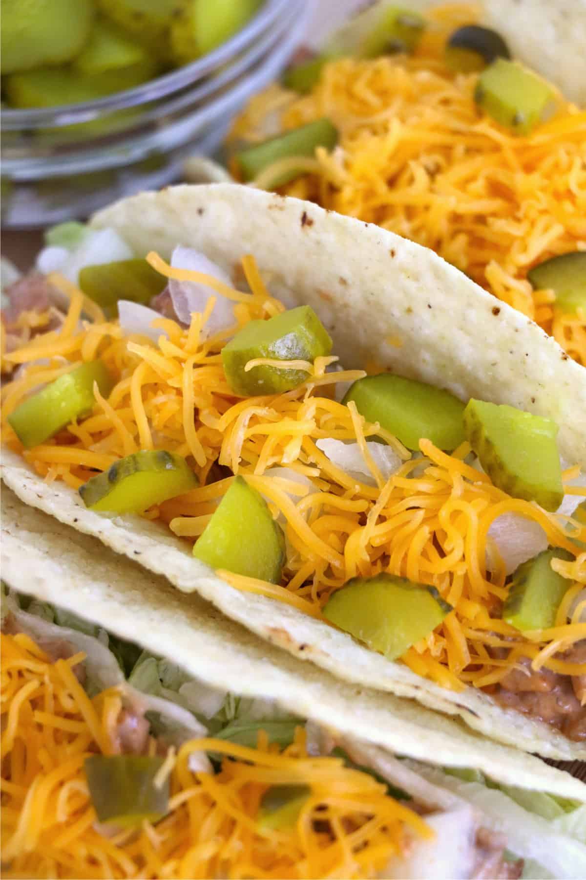 - Assemble the tacos with lettuce, meat mixture, onion, cheese, and pickles.