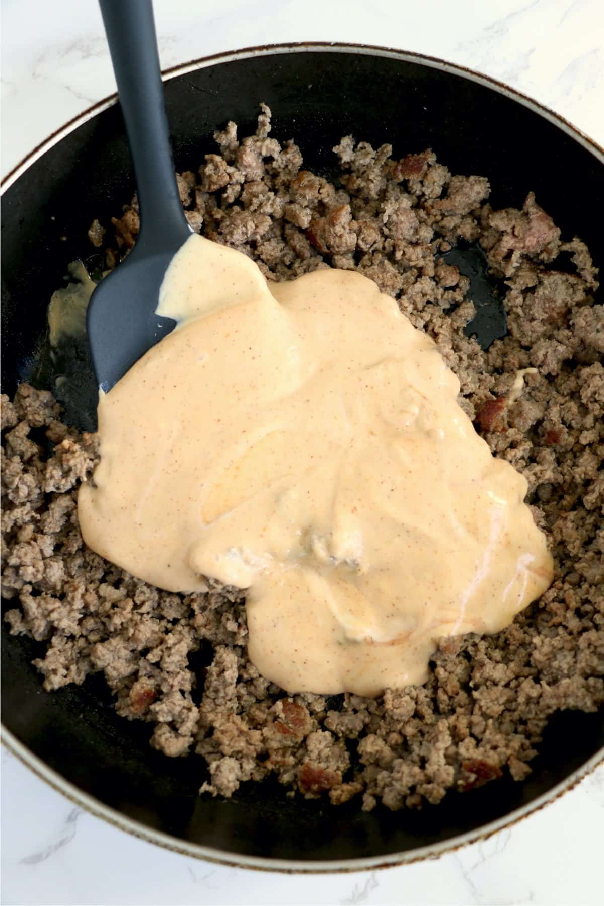 - When no pink is showing in the ground beef, stir sauce into meat until evenly coated.