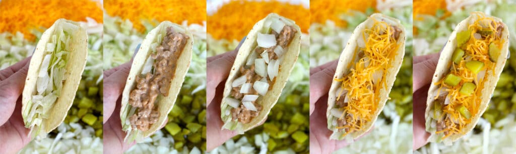 Step 3: Assemble the tacos with lettuce, meat mixture, onion, cheese, and pickles.