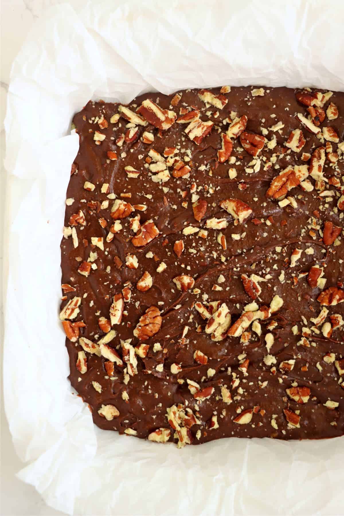 - Transfer batter to your prepared pan. Sprinkle remaining pecans on top.