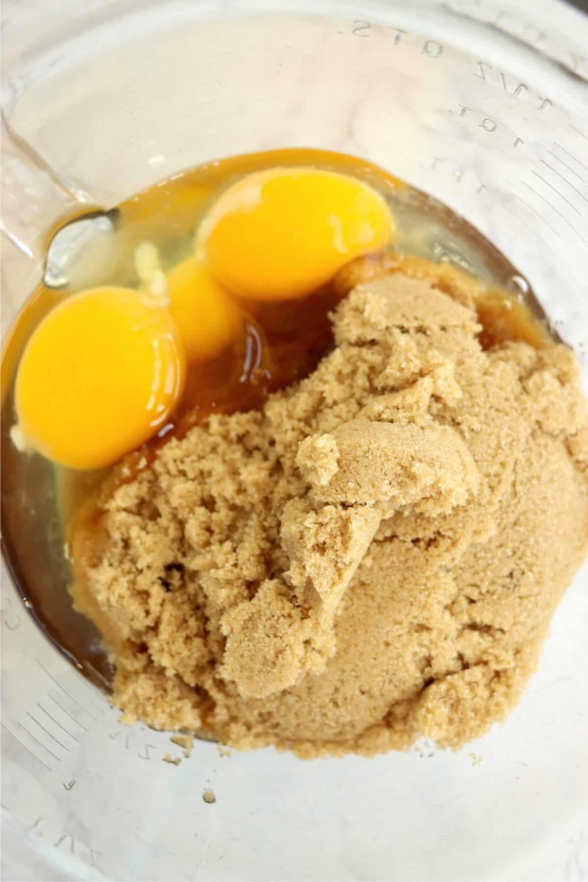 - In a medium mixing bowl, beat brown sugar and eggs together until light and fluffy.