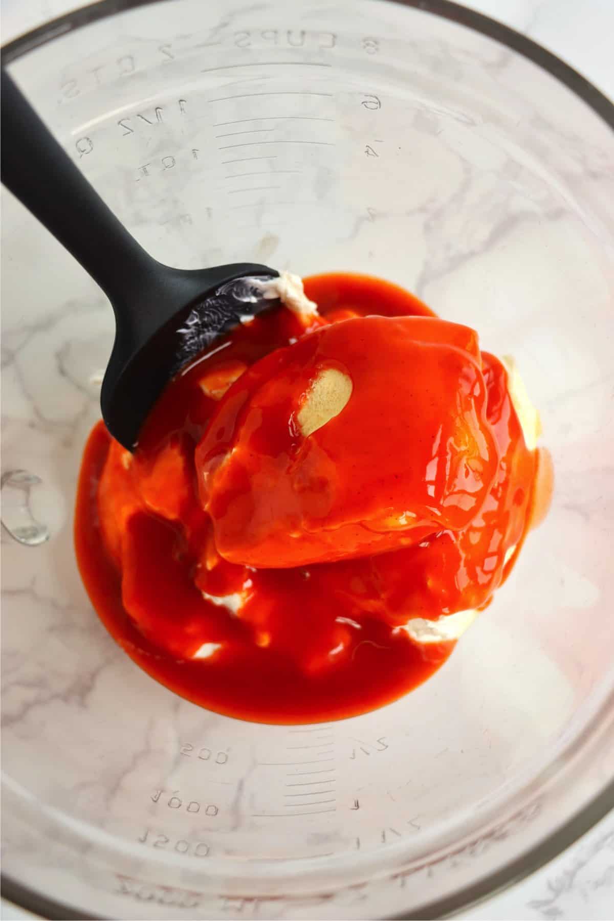- In a medium mixing bowl, beat cream cheese, sour cream, buffalo sauce, and garlic powder until smooth.