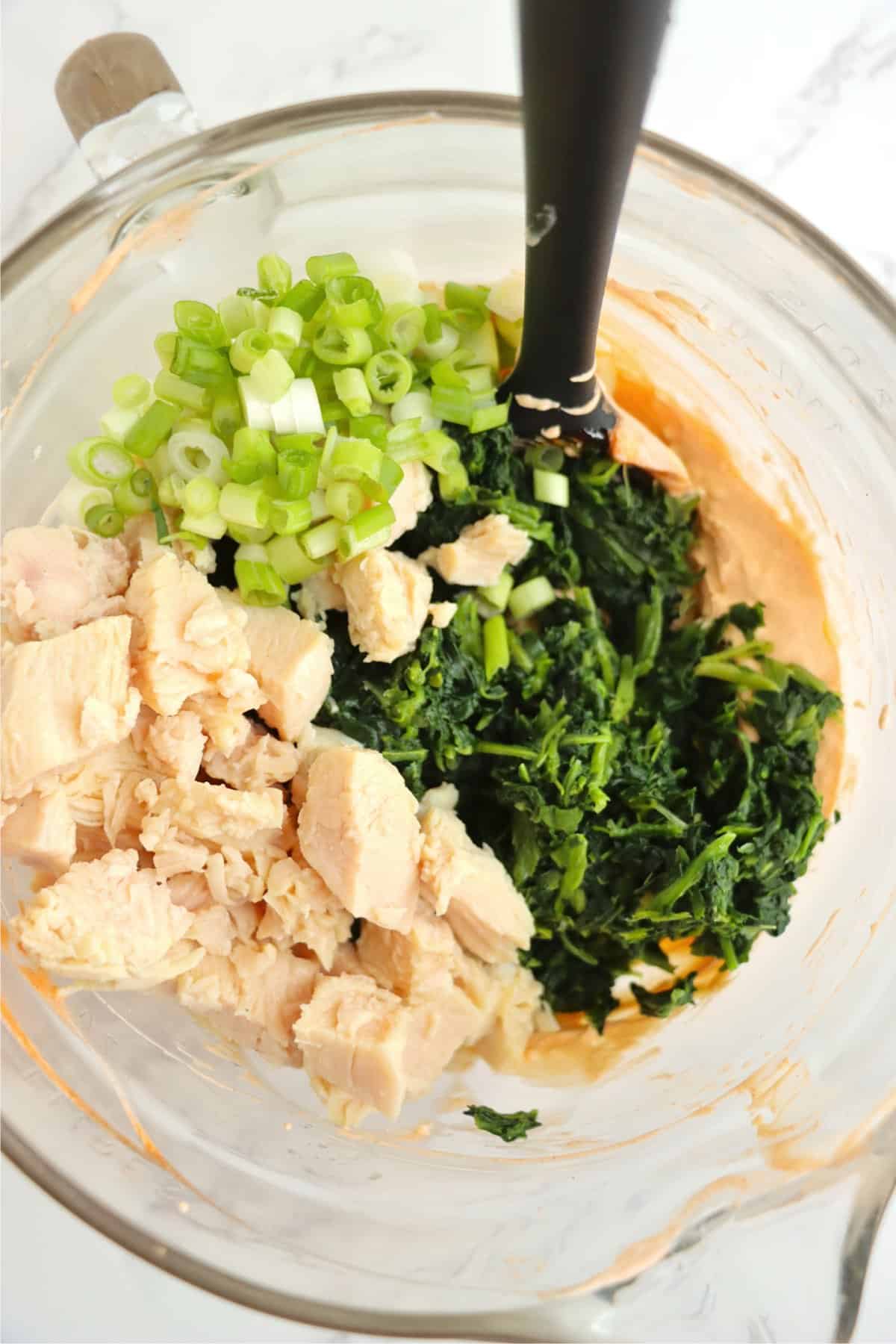 - Add chicken, spinach, and green onions. Stir until well-combined.