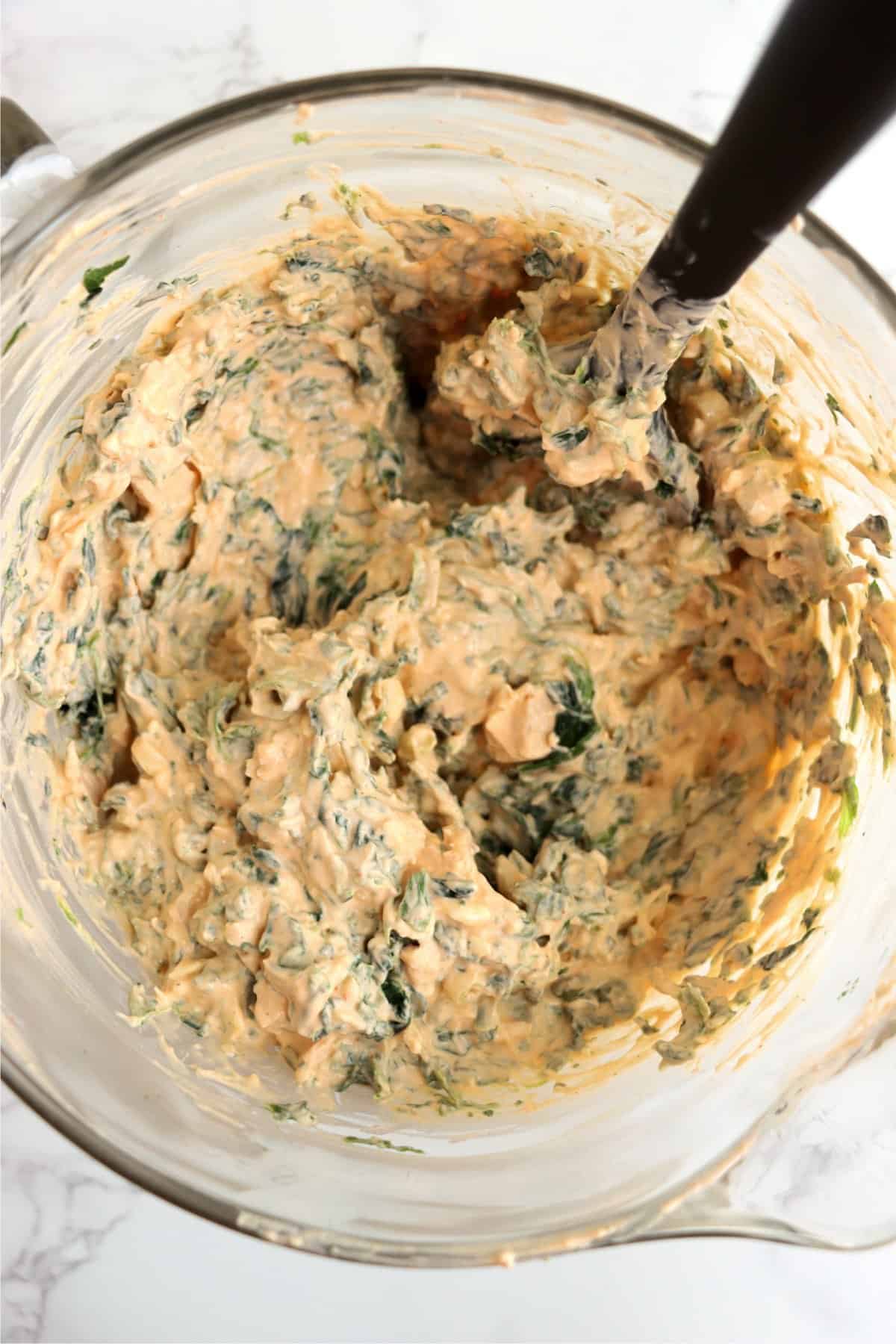 Party food is the best food, and two of my great party food loves are Buffalo chicken dip and spinach dip. Both of them really hit the spot with some chips, crackers, or veggies. So I decided to put them together. The result is this hot and spicy, chicken-filled take on spinach dip that you're going to love.